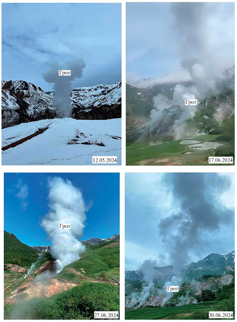 Рис. 2. Фото извержений гейзера Грот, записанные инструментально и зафиксированные визуально 12.05.2024 (фото Е.Л. Субботиной), 17.06.2024, 27.06.2024, 30.06.2024 г. (фото В.П. Коханова).