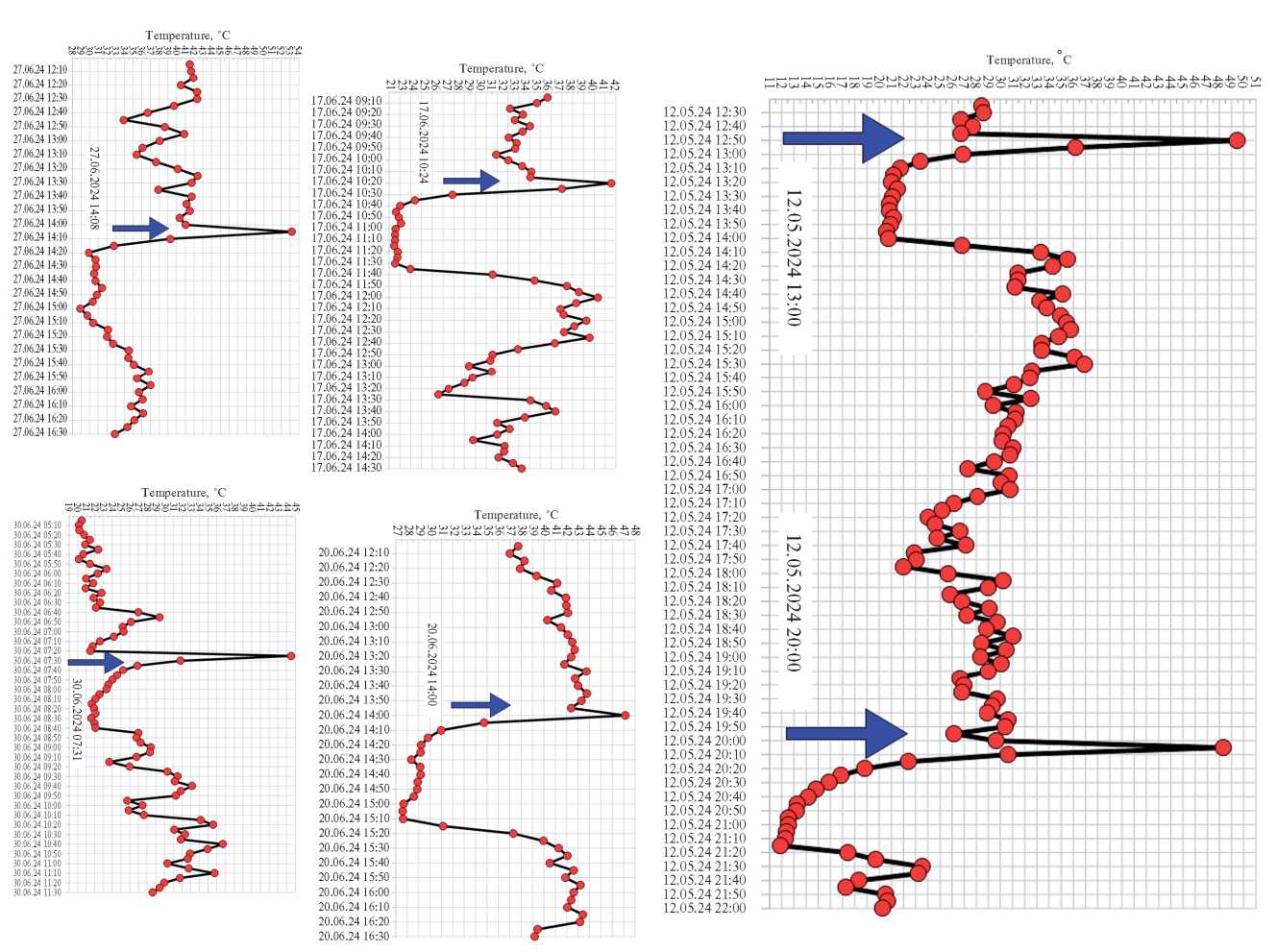 Рис. 3. Примеры инструментальной записи извержений гейзера Грот, заверенные визуальными наблюдениями: 12.05.2024 13:00, 12.05.2024 20:00, 17.06.2024 10:24, 20.06.2024 14:00, 27.06.2024 14:08, 30.06.2024 07:31.