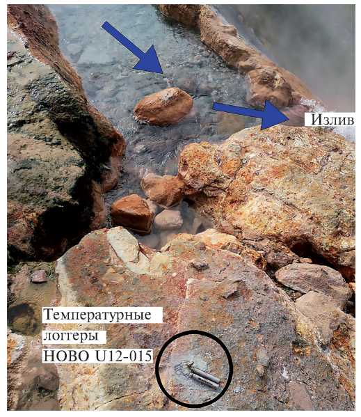 Место установки логгеров на фотографии показано кружком, стрелки показывают направление истечения воды из гейзера Грот.