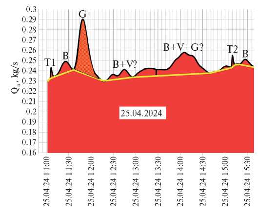 Применение ХТ метода (см. рис. 6) для оценки объема извержения гейзера Грот 25.04.2024 г, зафиксированного в 10:35 по данным инструментальных наблюдений (см. рис. 5) осуществлялось в следующей последовательности: 1) сначала были определены по формуле (4) расходы р. Гейзерная по данным двух запусков NaCl трассера (11:00, 2 кг и 15:10, 2 кг) – расходы оказались равными 1658 и 1567 кг/с, соответственно средний расход р. Гейзерная Qr = 1613 кг/с; 2) затем по формуле (2) определена масса хлор-иона в импульсе от Грота – 46.8 кг (см. рис. 6); 3) далее по формуле (3) рассчитан объем извержения гейзера Грот V = 69.3 м3, при концентрации хлор-иона на изливе Грота Cg = 675 ррм (проба отобрана 10.09.2024).