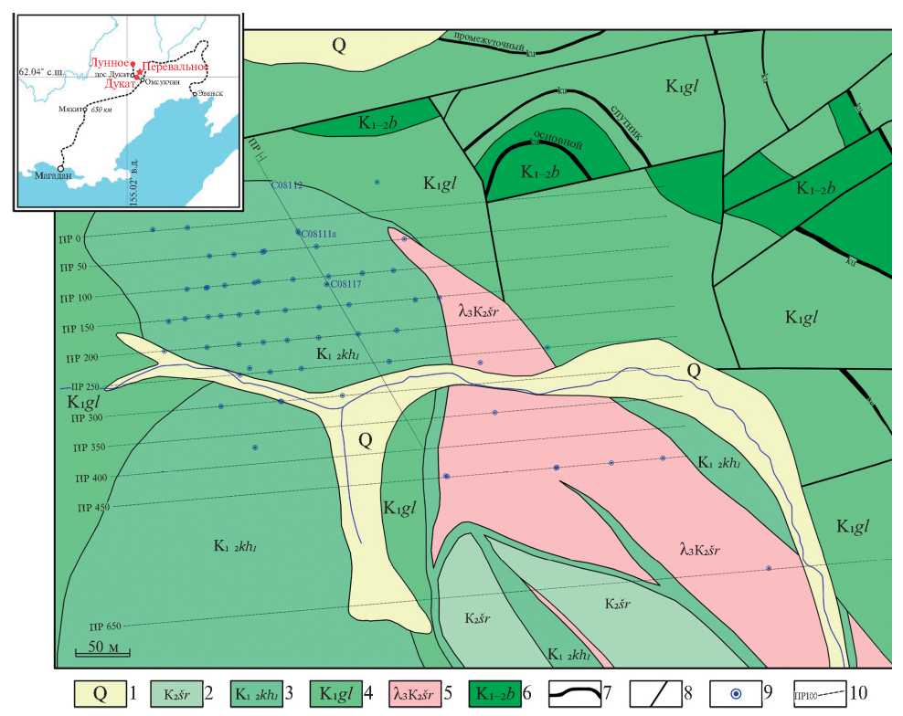 В геологическом строении месторождения принимают участие терригенные и вулканогенные толщи мелового возраста, прорванные интрузивными и субвулканическими телами кислого и среднего составов ранне‒позднемелового и позднемелового возрастов (см. рис. 1).