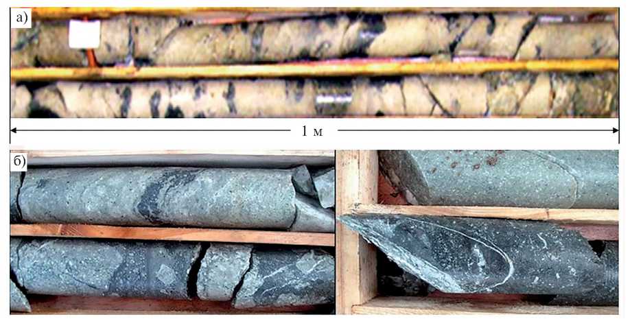 Рис. 3. Текстурные особенности руд месторождения Перевальное. а – сульфидно-сидеритовая минерализация (скв. 08201, интервал 314.3–316.2); б – оруденелые брекчии невадитов с поздними прожилками кварца (скв. 08202, интервал 338.8–340).
