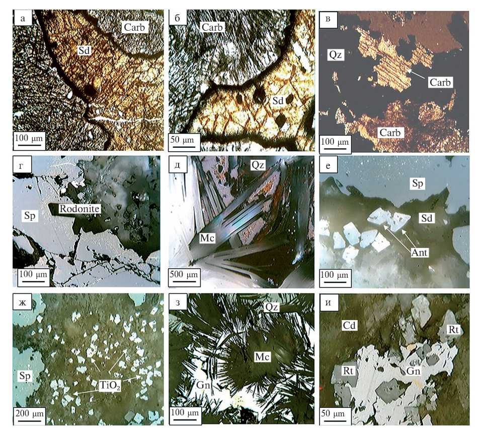 Рис. 5. Срастания жильных и рудных минералов. а, б – формы выделения сидерита и родохрозита, в – поздний кварц корродирует карбонат (а, б – в проходящем свете; в – в отраженном); г – родонит корродирует сфалерит, в результате термометаморфизма вокруг родонита сгущается эмульсионная вкрапленность халькопирита; д – агрегат крупночешуйчатого мусковита с включениями самородного серебра в интерстициях (в проходящем свете); е – идиоморфные кристаллы анатаза в сидерите (серое сверху – сфалерит); ж – скопления рутила в сидерите; з – наложение мусковита при грейзенизации сульфидной руды; и – срастание рутила и анатаза с вкрапленником галенита в сидерите.