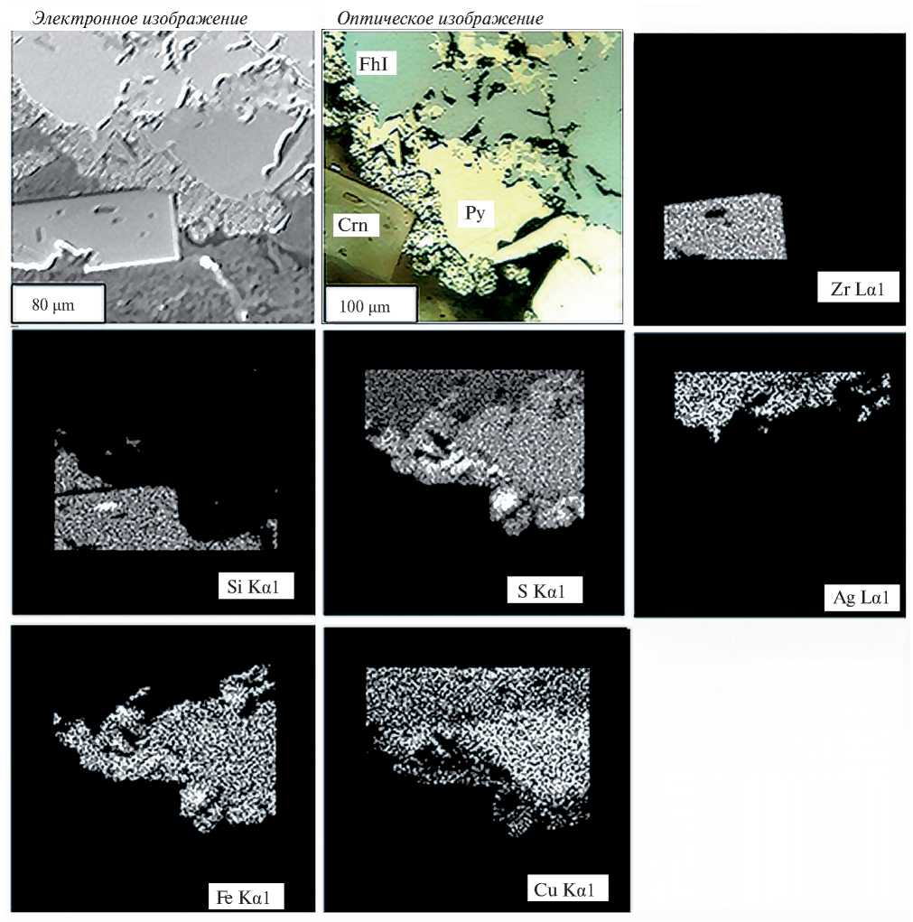 Рис. 7. Срастание циркона с сульфидно-серебро-полиметаллической рудой месторождения Перевального: электронное и оптическое изображения и распределение химических элементов в характеристических рентгеновских лучах.