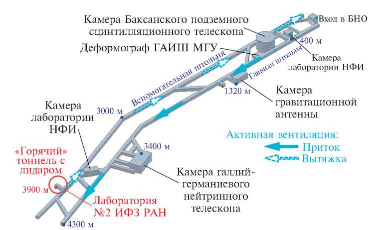 Рис. 1. Схема тоннелей БНО, расположенных под горой Андырчи на высоте 1700 м над уровнем моря.