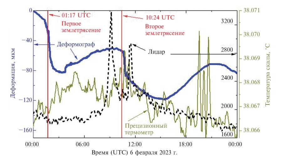 Рис. 3. Вариации сигналов деформографа (синяя толстая линия), лидара (пунктир) и температуры скалы (тонкая линия) во время землетрясений в Турции 06.02.2023.