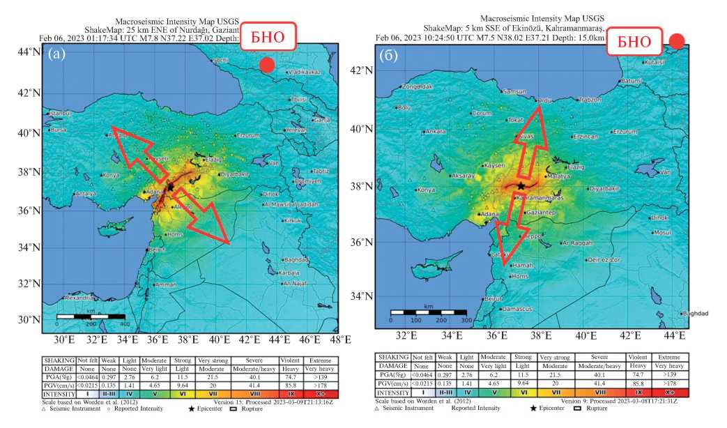 Из рис. 3 видно, что первое и второе землетрясения отразились на сигнале деформографа на фазе сжатия коры в 01:17 и 10:24 UTC. Отметим сильные искажения кривой деформации после первого удара в виде резкого сжатия плеча интерферометра и “отскока” с расширением (~04:00–10:00). При этом расширение ограничено напряженным состоянием породы (см. рис. 2, интерференционные полосы) в отличие от плавного расширения, например, в интервале 16:00–22:00. При этом заметно, что скачок сжатия от второго землетрясения (10:24 UTC) заметно короче, чем от первого, несмотря на то что мощность первого землетрясения была выше (М 7.8). Скорее всего, данное отличие обусловлено ориентацией линий разломов первого (под углом к меридиану) и второго землетрясения (под 90° к меридиану), а также и волн деформации (рис. 4). Так, волны деформации от первого землетрясения направлены в сторону Румынии, тогда как от второго удара – в сторону Эльбруса и БНО, как это видно по стрелкам на рис. 4а и 4б. Обнаруженная асимметрия проявляется также в том, что в момент первого землетрясения нет повышения температуры внутри канала в скальных породах БНО, а также выхода аэрозолей и сигнала лидара, соответственно, которые отчетливо проявились в окрестности второго землетрясения.