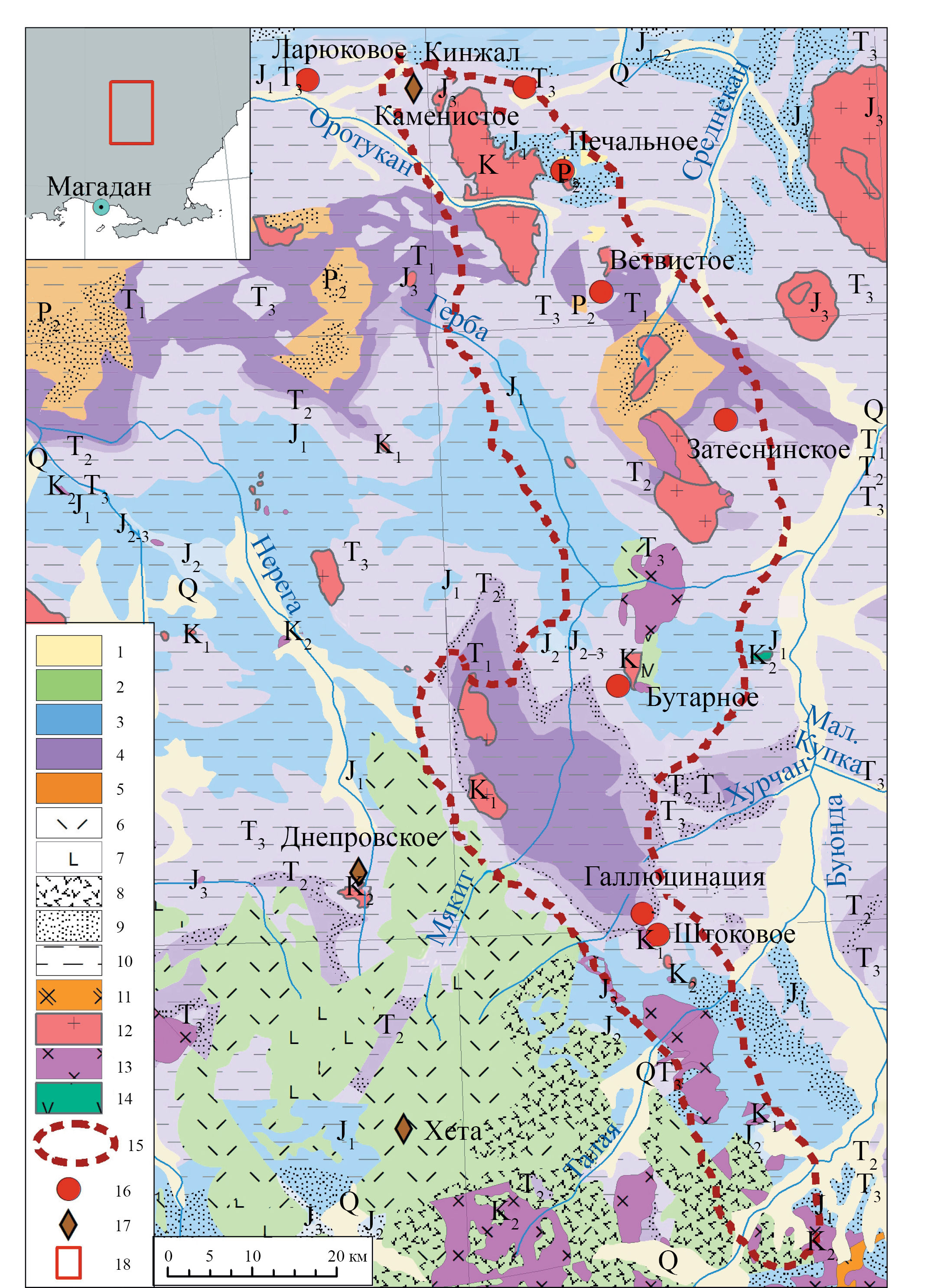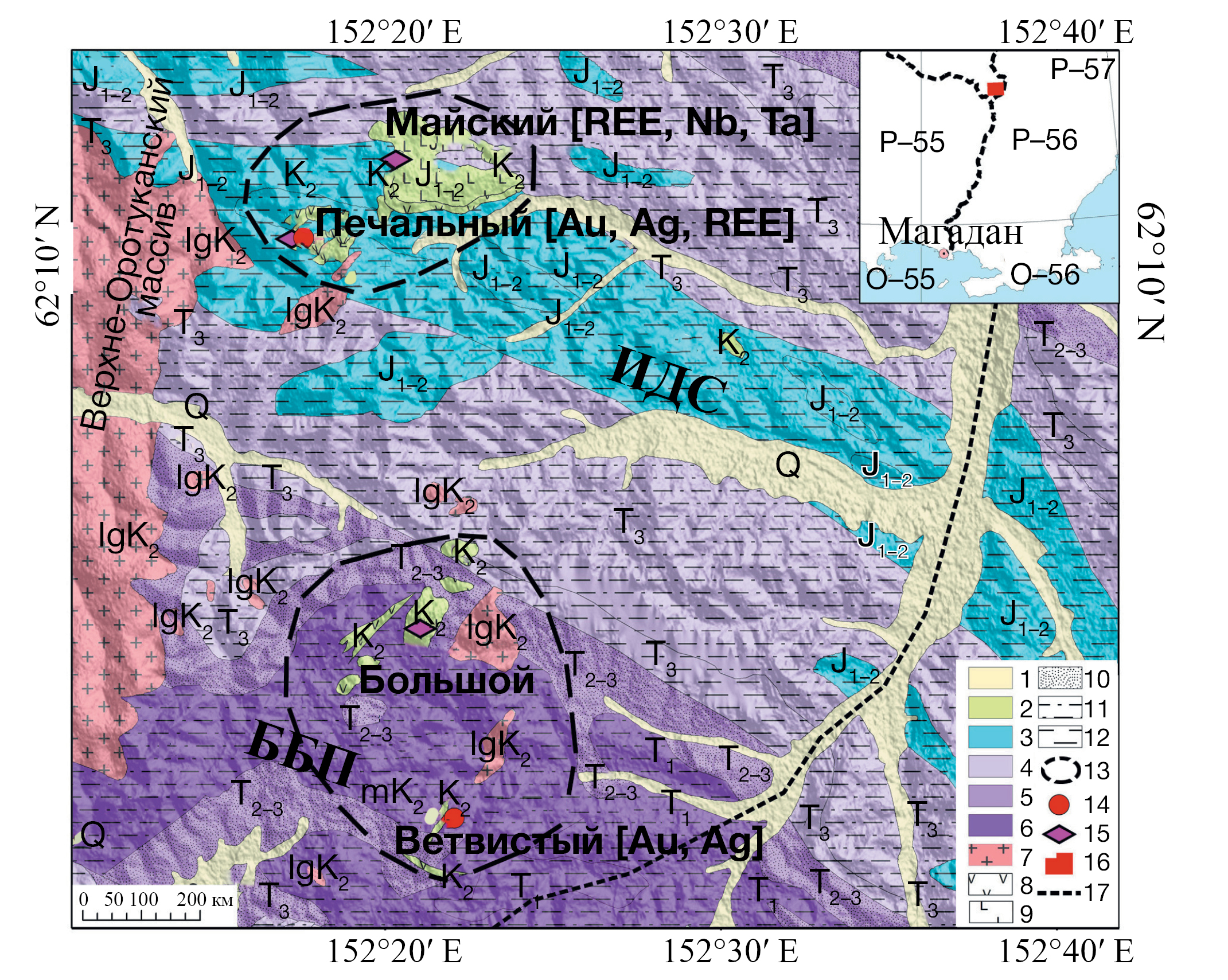 На северо-западном фланге Хурчан-Оротуканской тектономагматической активизации (ТМА) (рис. 1) в конце 1970-х гг. были открыты Au–Ag эпитермальные месторождения Печальное и Ветвистое в нижнеюрских черносланцевых толщах фундамента вулкано-купольных структур (ВКС). Кроме того, в этих же ВКС были выявлены потенциально перспективные в промышленном отношении проявления редких металлов и РЗЭ в щелочных риолитах [Егоров и др., 2005; Волков и др., 2023; Grigorieva et al., 2024].