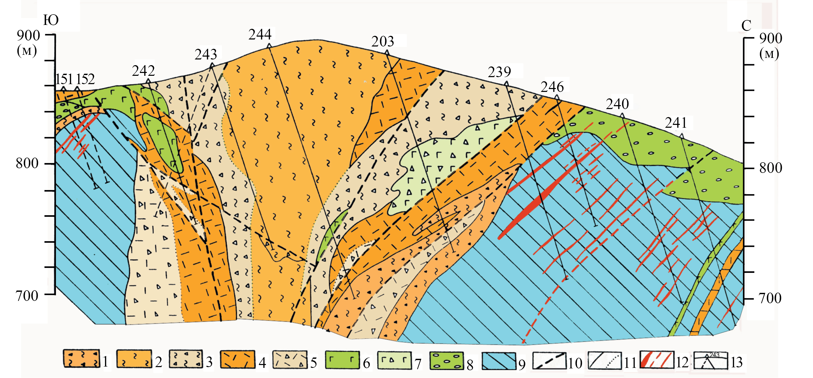Рис. 3. Геологический разрез г. Риолитовой (месторождение Печальное) по буровому профилю по (Кузнецов, 19912) с изменениями.
