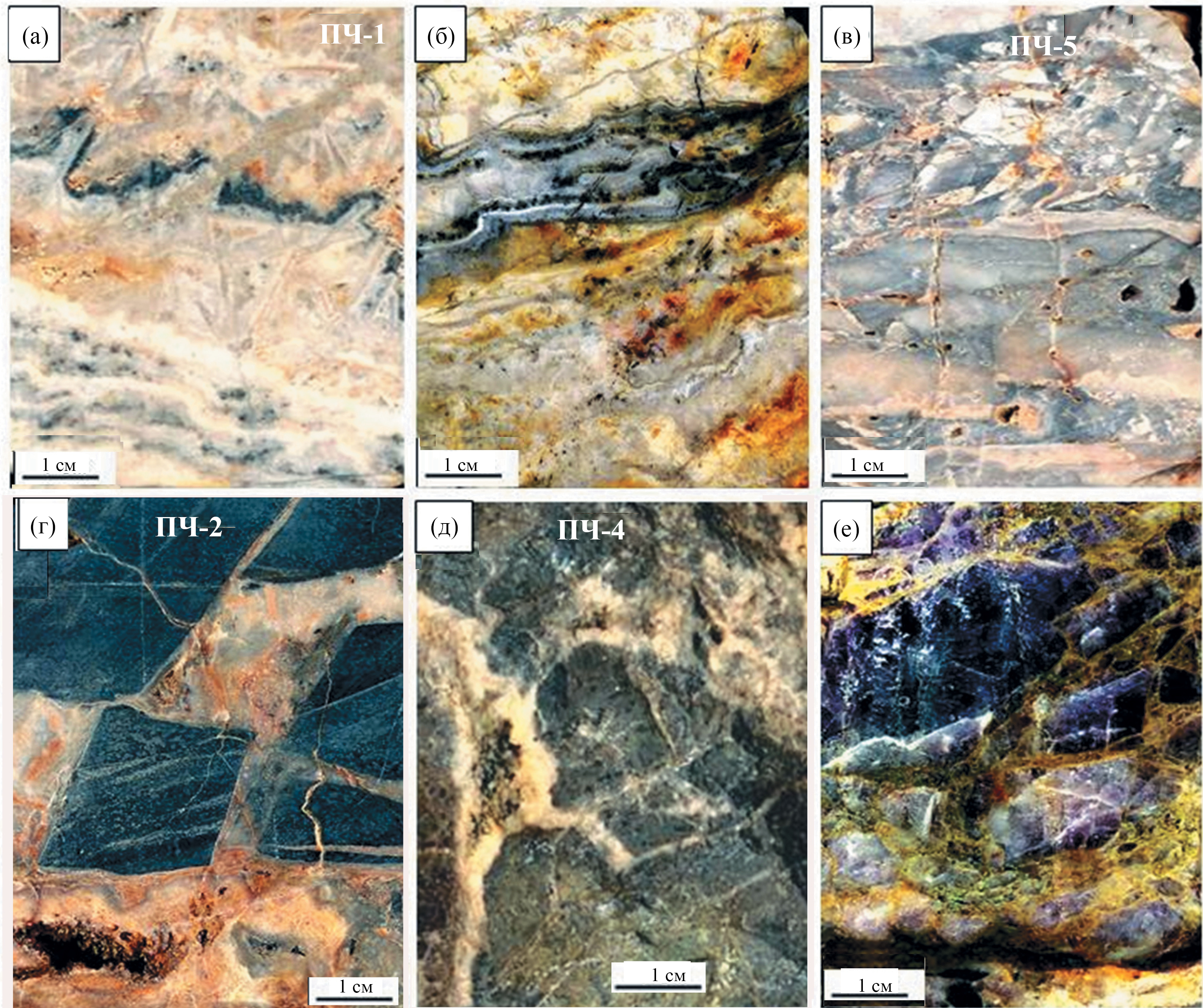 а, б — сочетание колломорфно-полосчатой и каркасно-пластинчатой текстур; в — брекчия с остроугольными обломками осветленного риолита; г — брекчия с обломками роговиков в кварцевом цементе и друзовой текстурой в занорышах; д — туффизит по В.М. Кузнецову (1991) с просечками карбоната; е — брекчия с крупными обломками флюорита в туфизитовой матрице. ПЧ-1 и др. соответствуют номерам в таблицах 3 и 4, а также местам отбора проб — ПЧ-1, траншея-701(В), ж-1, гор. 860 м; ПЧ-2, траншея-701(В), вмещающие породы, гор. 860 м; ПЧ-4, К-713, гор. 750 м; ПЧ-5, К-725(Ю), гор. 720 м.