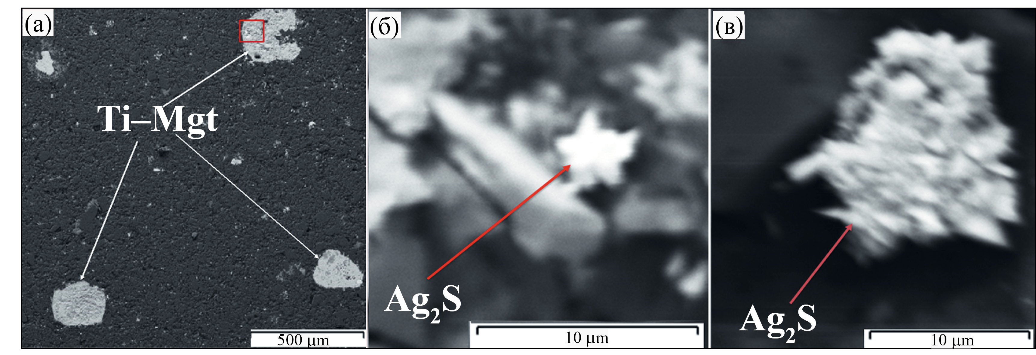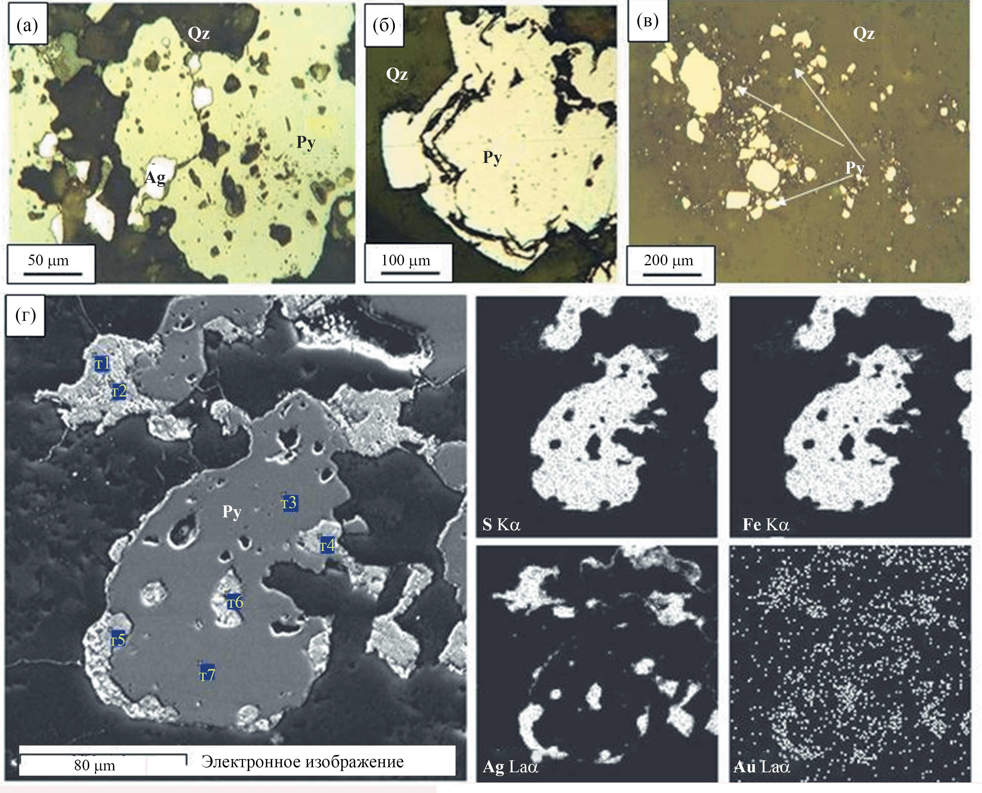 Пирит — широко распространенный рудный минерал, слагает гипидиоморфные и идиоморфные вкрапленники размером 0.2–0.8 мм в рудах и метасоматитах (рис. 5в). Нередко содержит каплевидные выделения золотистого (Au 3–5 мас. %) самородного серебра (см. рис. 5а, 5г). На отдельных участках отмечается (см. рис. 5б) ступенчатый рост кристаллов пирита, указывающий на нестабильный режим рудообразования. По составу близок к стехиометрическому (табл. 2).