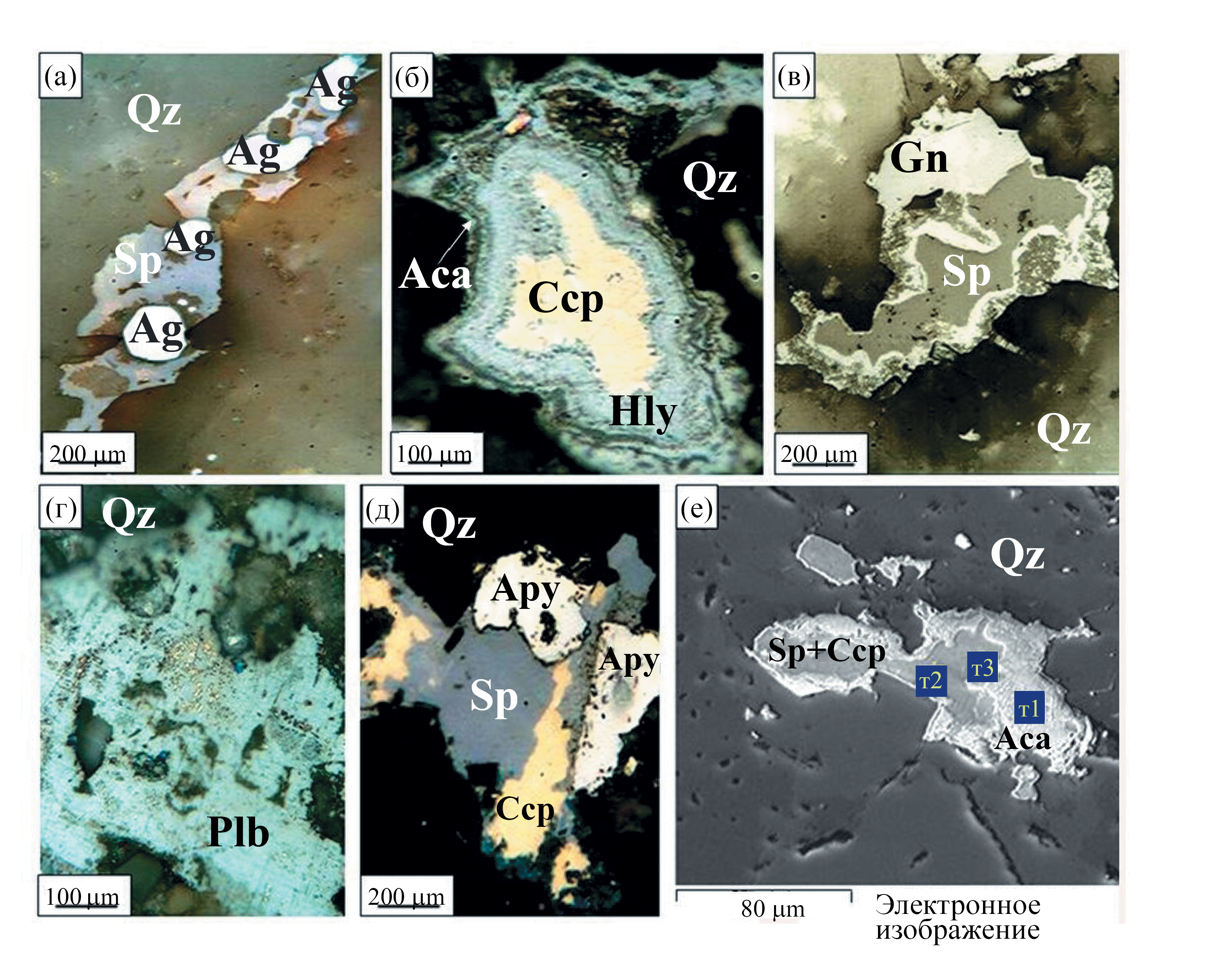 Для рудных минералов характерны мелкие выделения 0.5–0.05 мм, сосредоточенные в полосах халцедона, окрашенных рудной минерализацией в темный цвет, так называемых “гингуро”, мощность которых варьирует от долей мм до 0.5–1 см (см. рис. 4а, 4б). Количество рудных минералов в жилах не превышает 1–2%. В рудах насчитывается более 20 рудных минералов (табл. 1). Наиболее ранняя сульфидная минерализация представлена арсенопиритом, пиритом, марказитом, пирротином, халькопиритом, сфалеритом и антимонитом. Продуктивную ассоциацию образуют самородное серебро, полибазит, высокоселенистый акантит и низкопробное самородное золота.