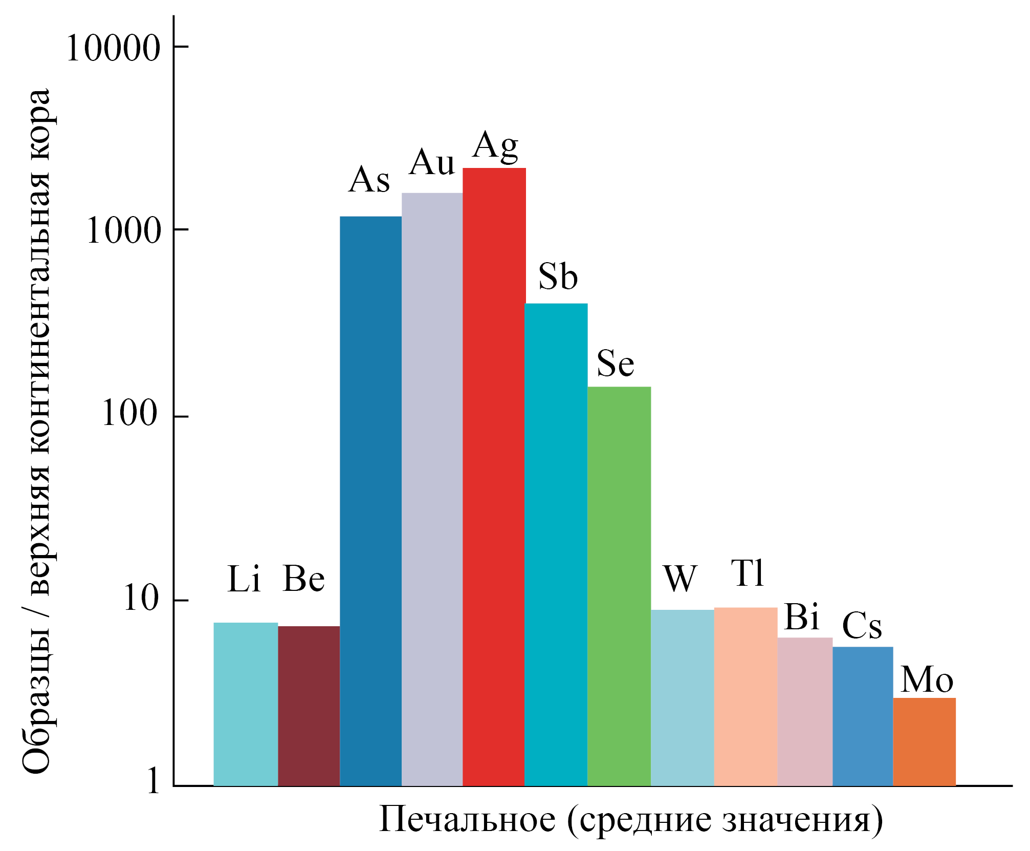Результаты геохимических исследований руд корреспондируют с минералогическими данными. Заметное обогащение эпитермальных руд довольно широким спектром микроэлементов (по рейтингу): Ag, Au, As, Sb, Sе, W, Tl, Li, Be, Bi, Cs, Mo, преобладание легких лантаноидов над тяжелыми, очень низкие Eu/Sm отношения (<<1), слабо наклонные близхондритовые спектры без европиевых минимумов или максимумов — типичны для эпитермальной рудообразующей системы месторождения Печальное. А соотношение значений Ce/Ce* и Eu/Eu* указывают на окислительные условия, преобладавшие при рудообразовании. Распределение РЗЭ в эпитермальных рудах во многом сходные по конфигурации со спектрами РЗЭ вмещающих терригенных пород верхоянского комплекса [Михалицына, Соцкая, 2020].