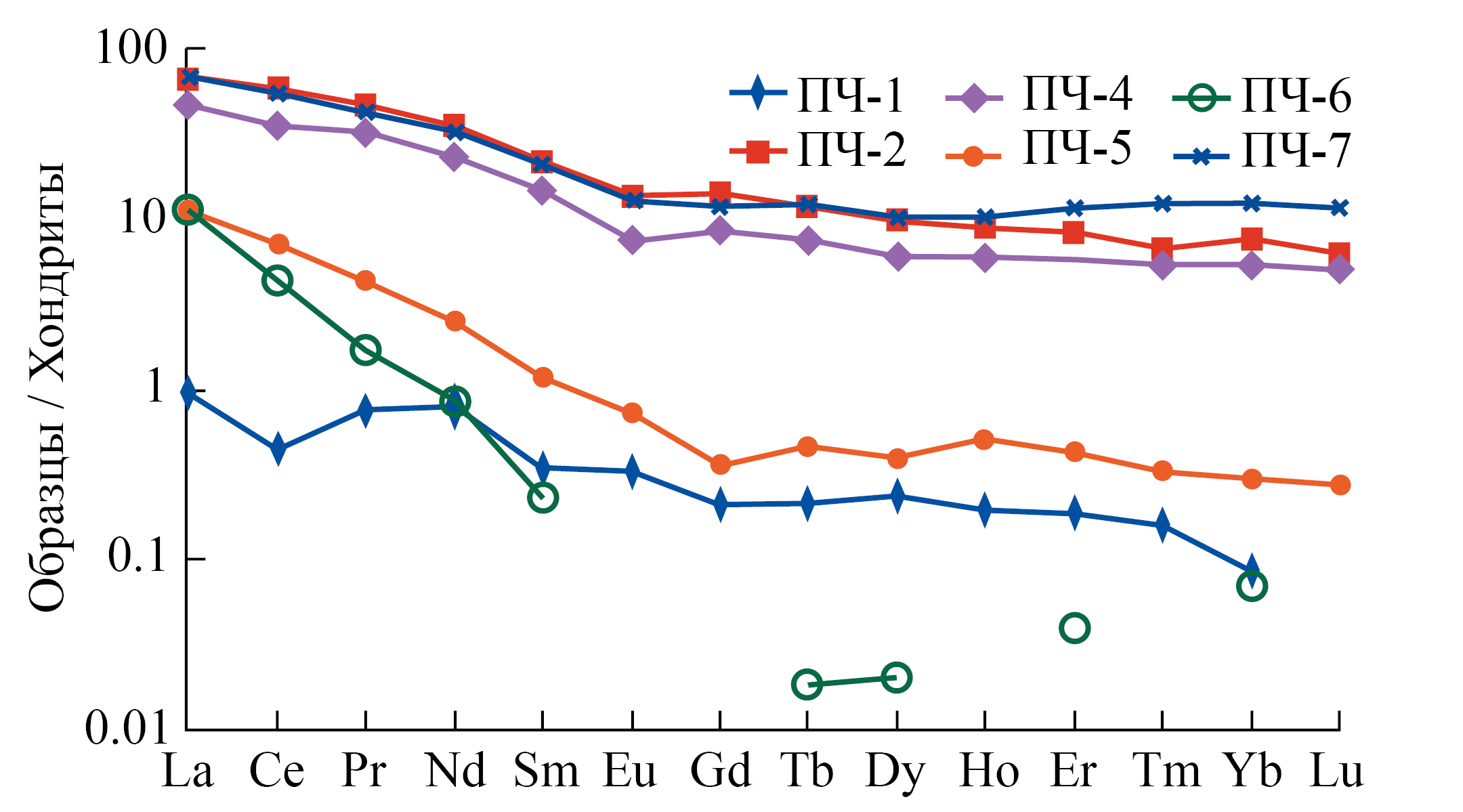 Рис. 10. Распределение РЗЭ, нормированных по хондритам [McDonough, Sun, 1995], в Au–Ag рудах месторождения Печального.