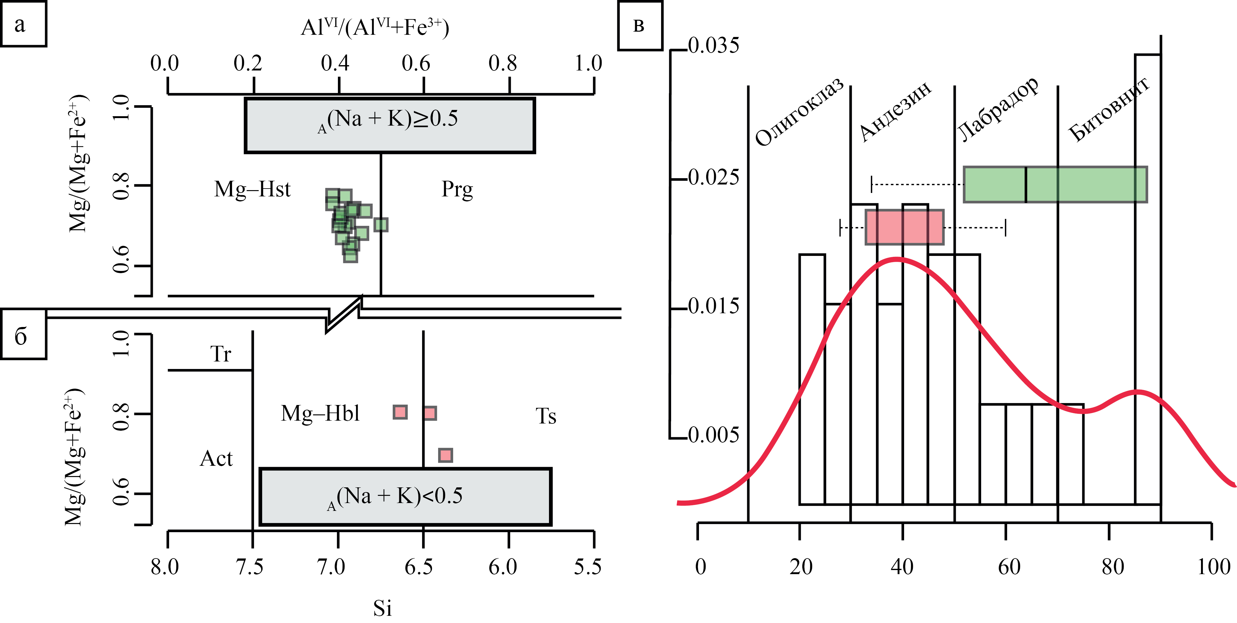 Рис. 5. Составы амфиболов (а, б) и плагиоклазов (в) кварцевых монцодиоритов викторинского комплекса на классификационных диаграммах [Leake et al., 1997].