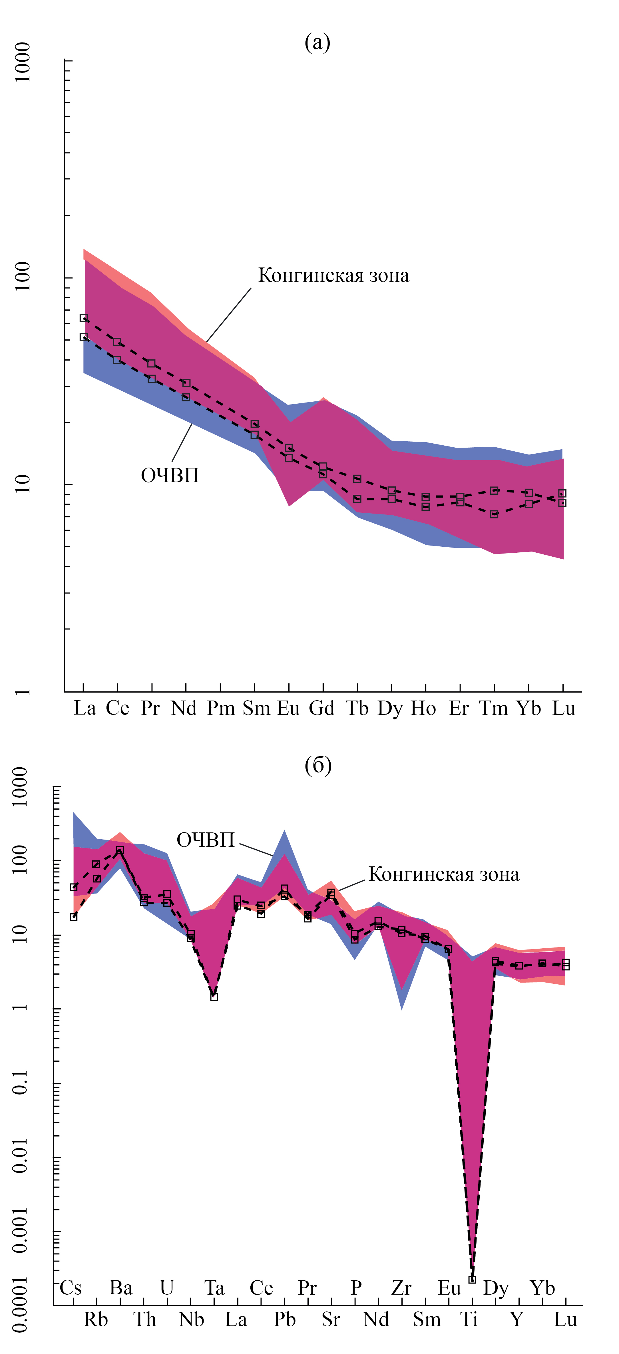 Гранитоиды викторинского комплекса, установленные в пределах рудных участков Конгинской МЗ — Лабазный, Захаренко, Седой, Джелты, относятся к породам высокоглиноземистым, нормально— и умеренно-щелочным калий-натриевого типа [Глухов и др., 2022]. Кварцевые монцодиориты рудного поля Лабазное характеризуются повышенными содержаниями (относительно кларка) As, Ba, Co, Cu, Ga, Mo, Mn, Sr, Te, Tl, V; отмечается значительное обогащение РЗЭ (коэффициент концентрации от 4.16 до 13.75); обогащены легкими РЗЭ относительно тяжелых ((La/Yb)N = = 6.5–7.1) и крупноионными литофильными элементами (LILE: Ba, U и Pb); обеднены высокозарядными, несовместимыми с расплавом элементами (HFSE: Nb, Ta и Ti) (рис. 7). На дискриминационной диаграмме Дж. Пирса [Pearce et al., 1984] кварцевые монцодиориты сопоставимы с гранитоидами вулканических дуг (см. рис. 6б).