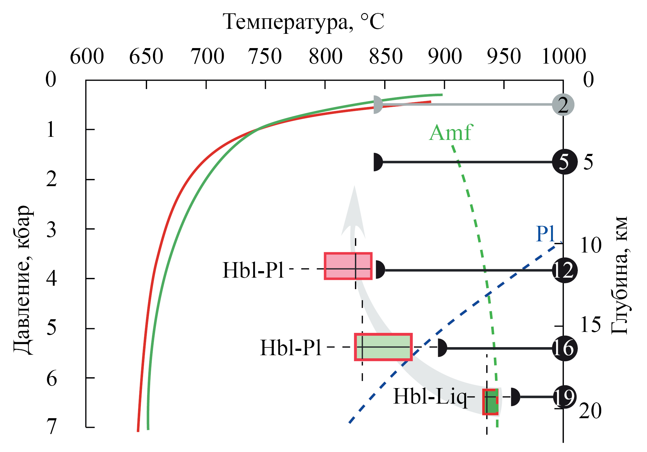 Оценка условий формирования кварцевых монцодиоритов на ранней магматической стадии выполнена по составам амфибола и плагиоклаза (термобарометр: Hbl−расплав [Putirka, 2016]; барометр: Al−in−Hbl [Mutch et al., 2016]; термометр: Hbl−Pl [Powell, Holland, 1994]) (табл. 2). Параметры давления и температуры поздней магматической стадии оценивались по барометру [Yang, 2017] и термометру [Duan et al., 2021] основанными на валовом составе средних и кислых магм.