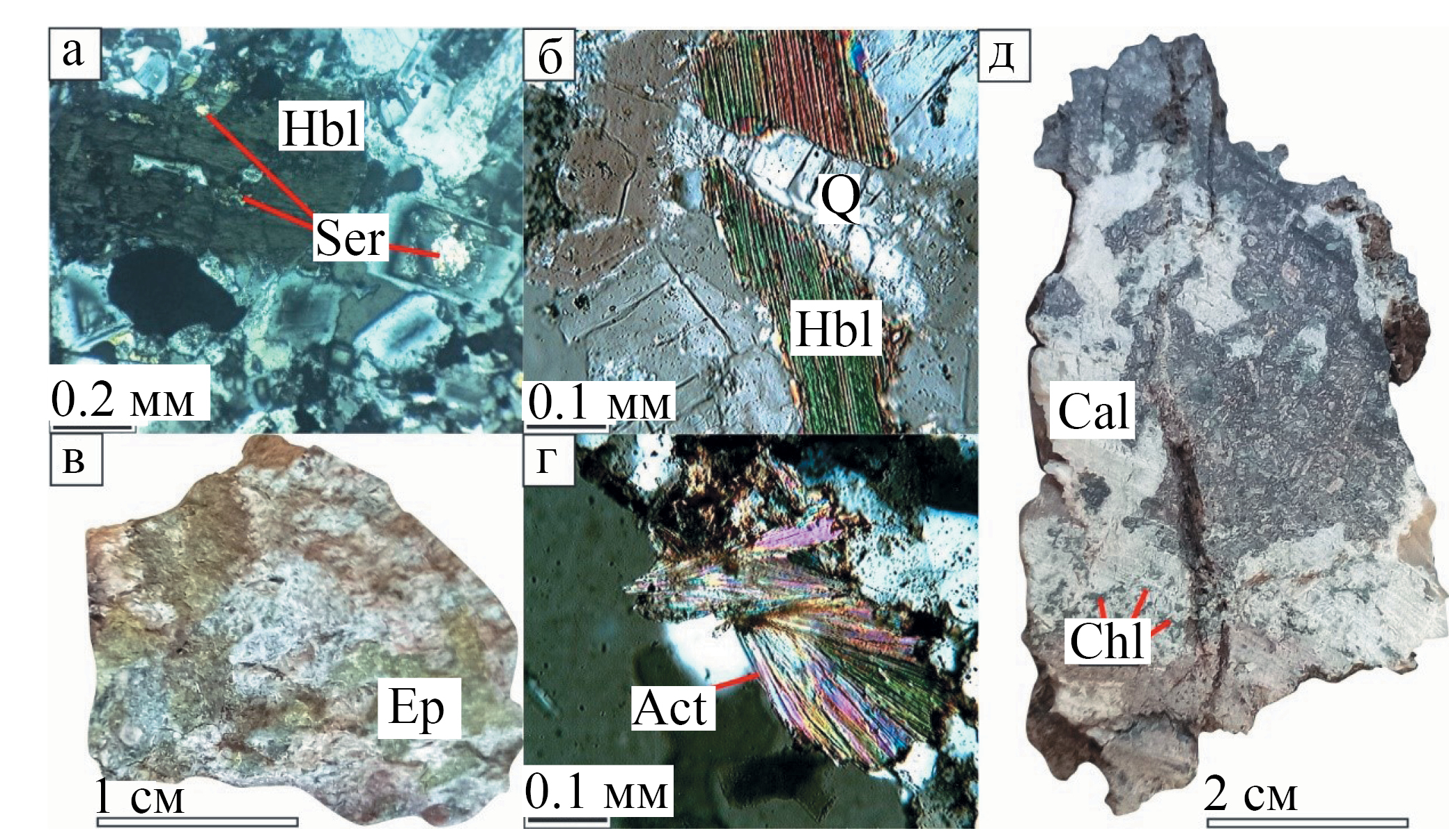 В основу работы положена авторская коллекция образцов, собранная в ходе полевых работ 2019 г. Петрографические и минералогические исследования осуществлялись авторами на микроскопе Axioplan Imagin с использованием программного комплекса PETRO [Ползуненков, Кондратьев, 2023]. Химические составы породообразующих и рудных минералов, в количестве 957 измерений по 10 образцам, определялись на микроанализаторе Camebax с использованием энергодисперсионного спектрометра X-Max (аналитики В.Ю. Соловьёв, Е.М. Горячева). Измерения проводились в условиях ускоряющего напряжения — 20 кВ, увеличения более ×400 и времени накопления спектров 30 с. Оптимизация для количественных вычислений выполнялась по химически чистой меди каждые 1.5–2.0 ч. В качестве стандартов использовались аттестованные природные [Jarosewich et al., 1980] и синтетические материалы. Предел обнаружения элементов составлял 0.3 мас. %, диаметр электронного луча 3–4 мкм.