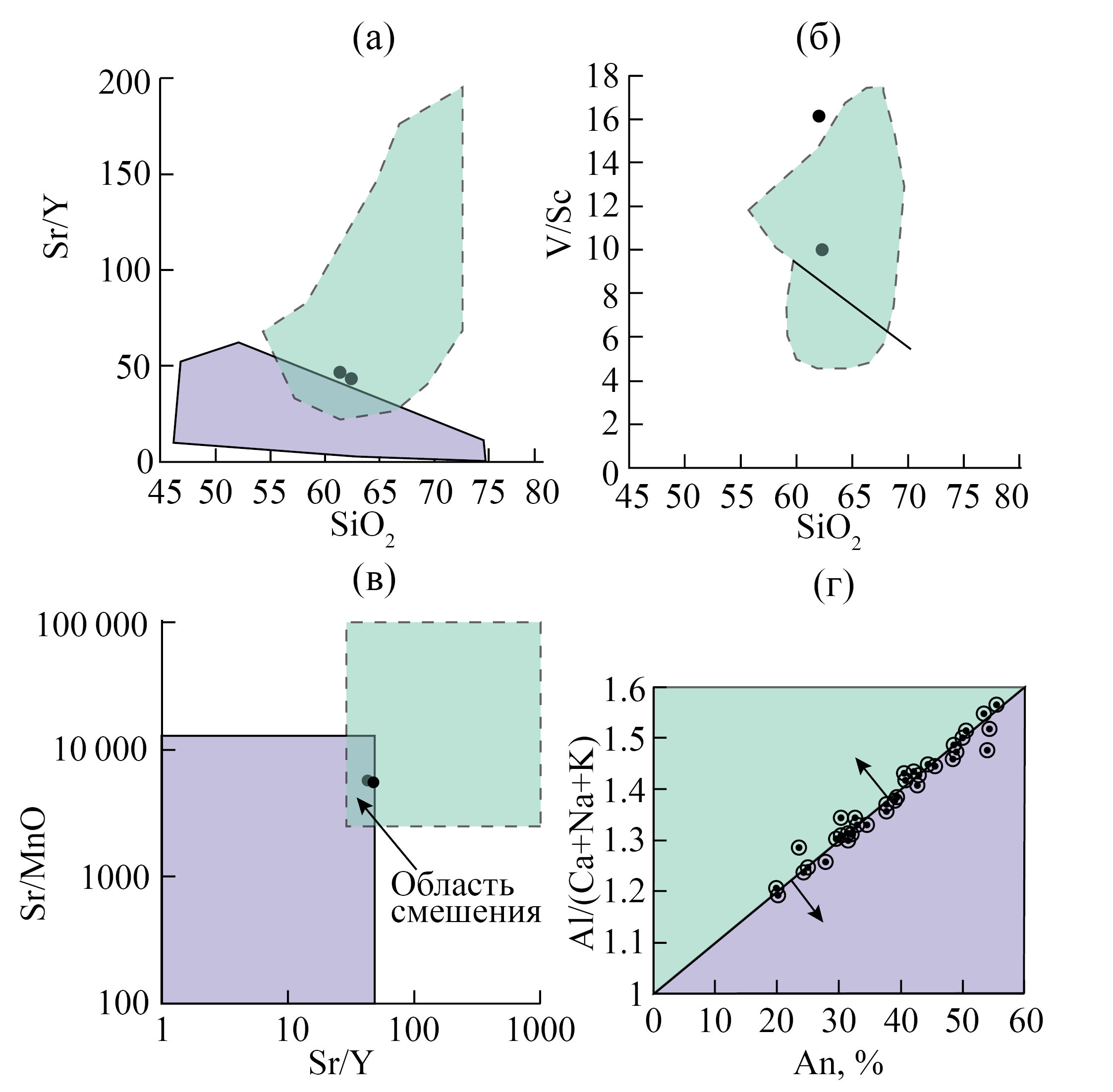 По положению фигуративных точек на классификационных диаграммах (рис. 6в, 6г) породы характеризуются как метаглиноземистые гранитоиды I-типа магнезиальной (FeOt/(FeOt+MgO) <0.78 мас. %) и высококалиевой известково-щелочной серий.
