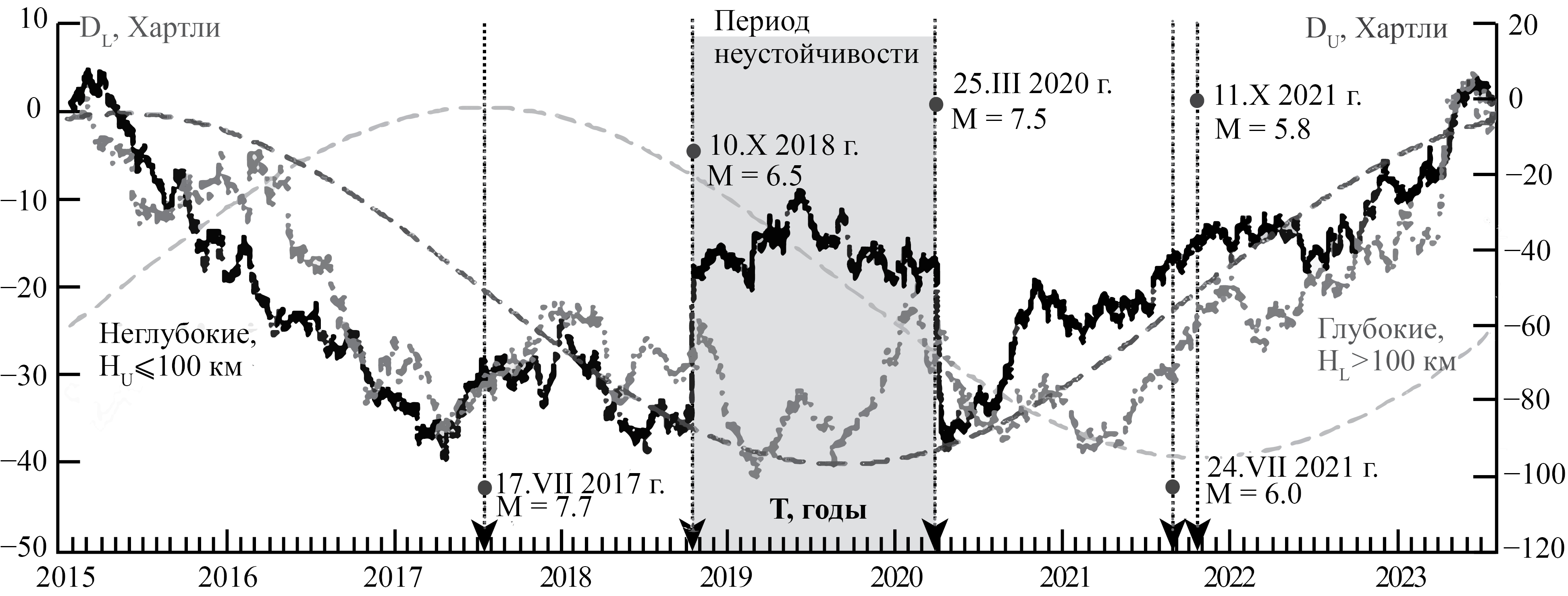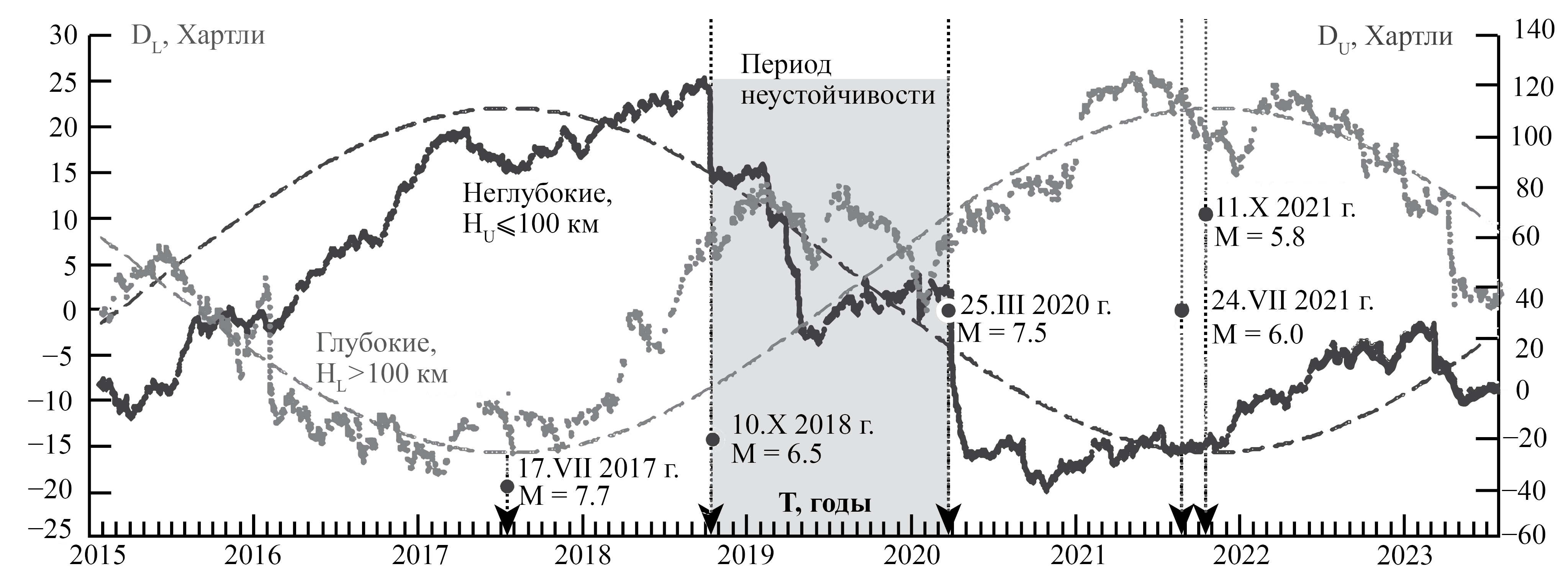 С учетом свойств глубинной геосреды естественно допустить кинематическую природу вариаций нормальных напряжений, определяемых движением участков океанической плиты по нормали к ее условной плоскости. В этом случае экстремумы кривых на рис. 1 соответствуют крайним положениям гипотетических колебательных движений. Соответственно, в период времени после сильнейшего Ближне-Алеутского землетрясения и до конца 2021 г. проходила фаза подъема погруженной части плиты, а далее проходит фаза ее опускания.