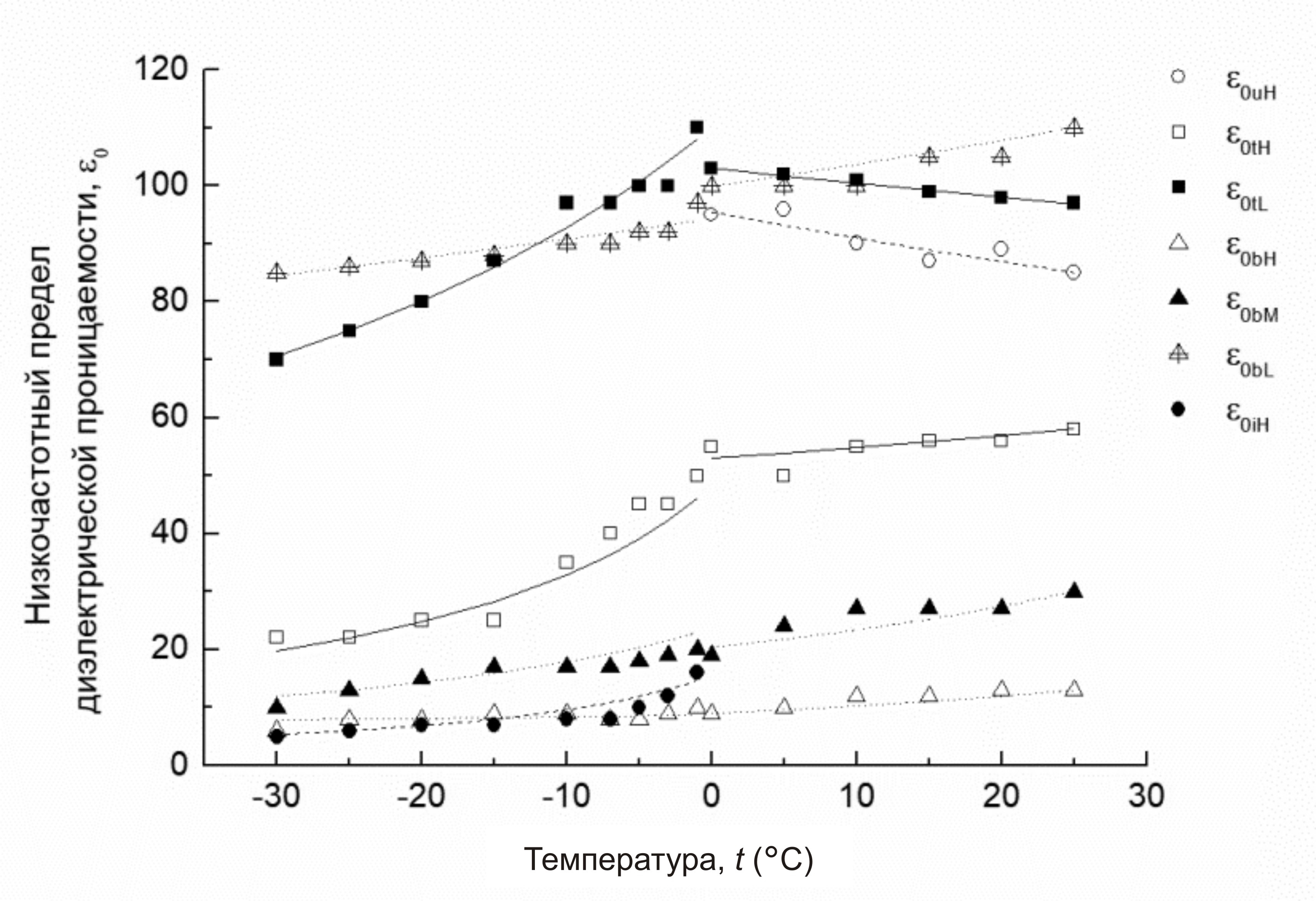 Рис. 4. Низкочастотный предел ДП как функция температуры. Символы — данные полученные из измерений, линии — соответствующие им аппроксимации, для связанной воды, ε0bQ, переходной связанной воды, ε0tQ, несвязанной воды, ε0uQ, и влажного льда, ε0iQ, для высоко- (Q = H), средне- (Q = M), и низкочастотной (Q = L) релаксации.