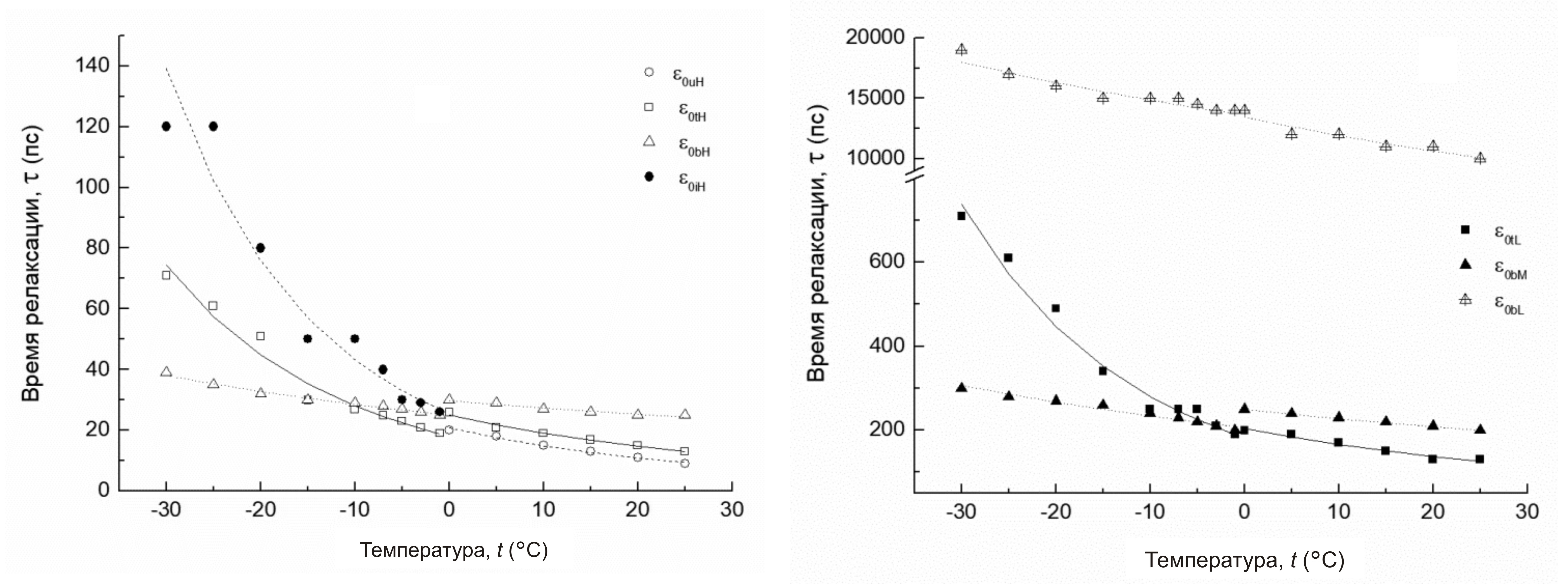Времена релаксации, определенные из диэлектрических измерений с помощью аппроксимации спектров для действительной части КДП для различных релаксаций и типов воды как функции температуры приведены на рис. 5. Эти времена релаксаций применимы для всех типов измеренных почв. Будем описывать зависимость времени релаксации от температуры как было ранее предложено в (Mironov et al., 2010a) с помощью формулы Эйринга