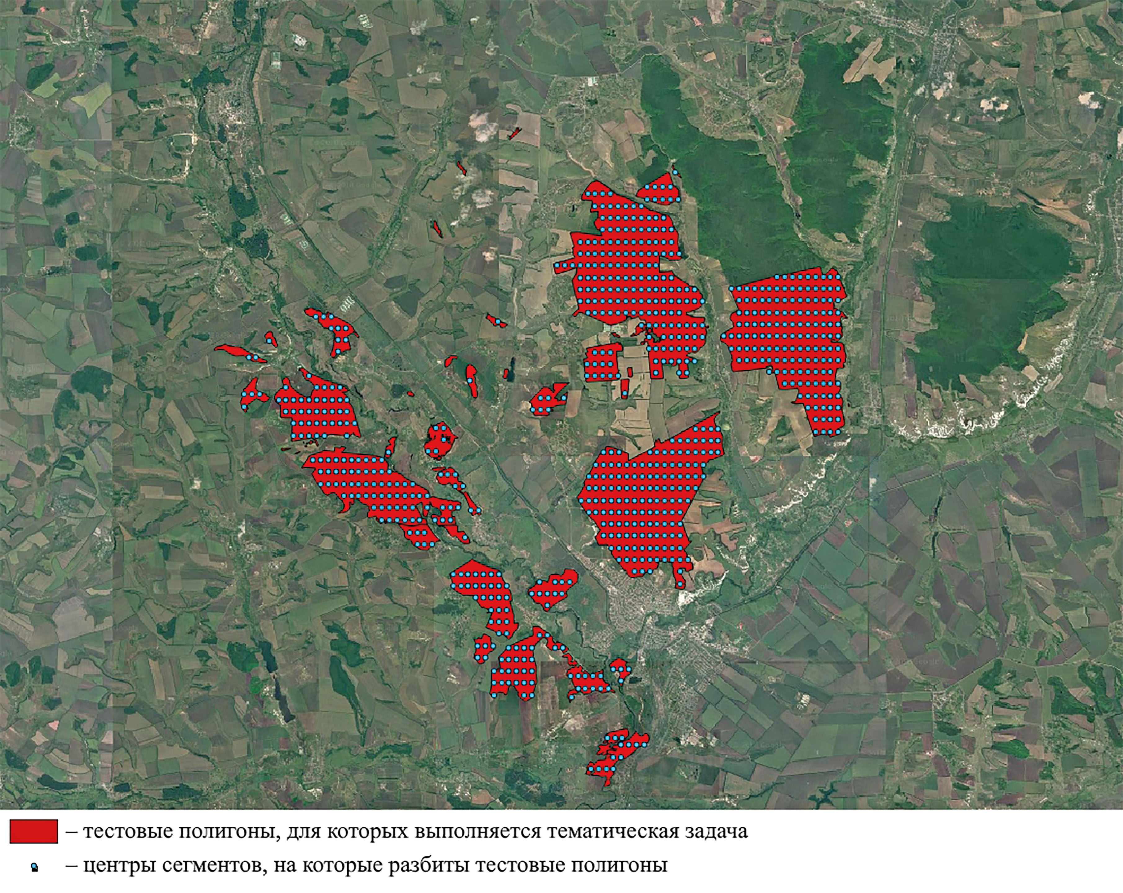 Будем оценивать оперативность НА-ГС при решении задач оценки лесистости, классификации отделов лесообразующих пород, классификации видового состава смешанных древостоев, классификации возрастных классов однородных древостоев. Выполняться эти задачи будут для лесов Валуйского района Белгородской области Российской Федерации. На рис. 1 приведен спутниковый снимок с обозначенными на нем тестовыми полигонами, для которых будет выполняться тематическая задача.