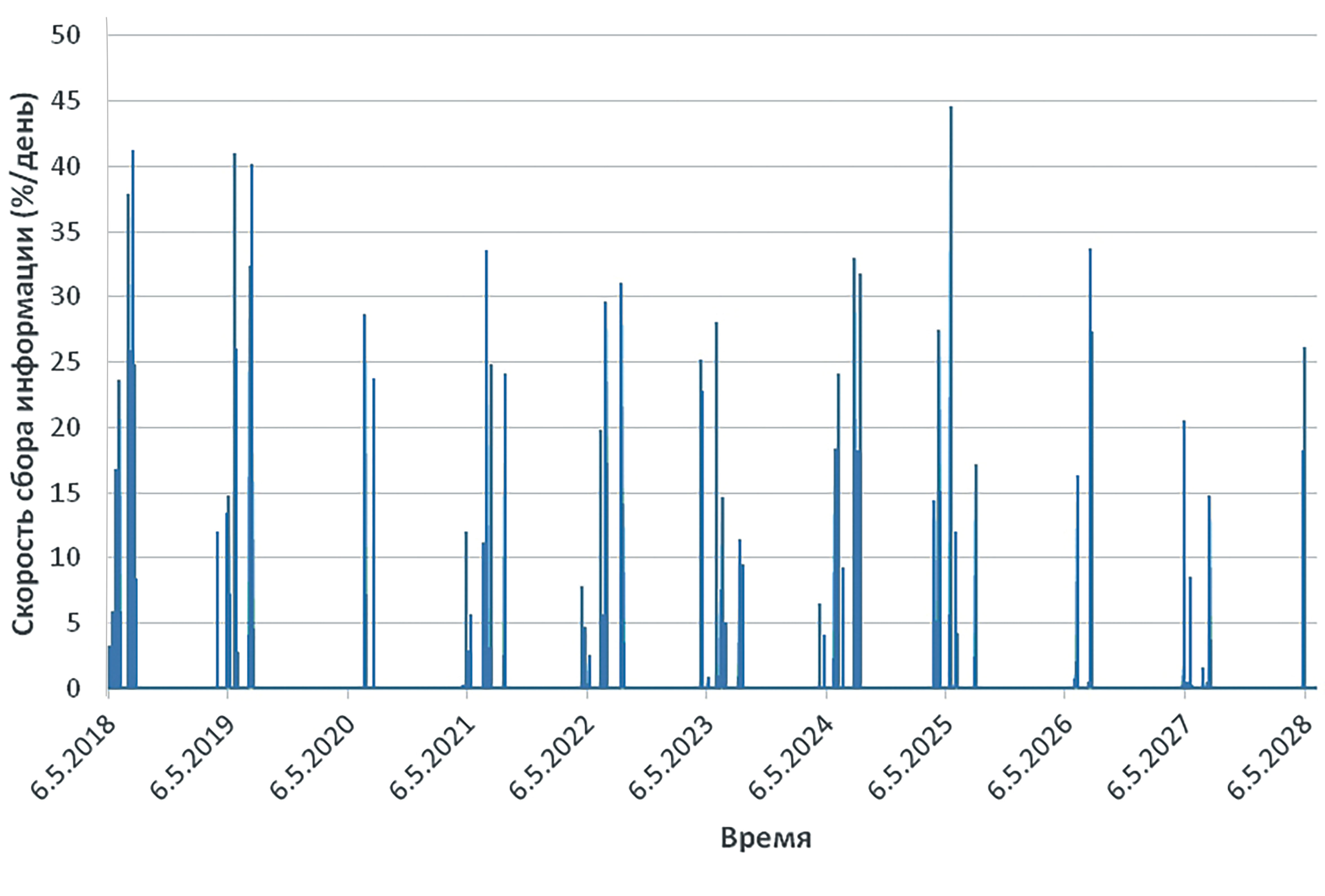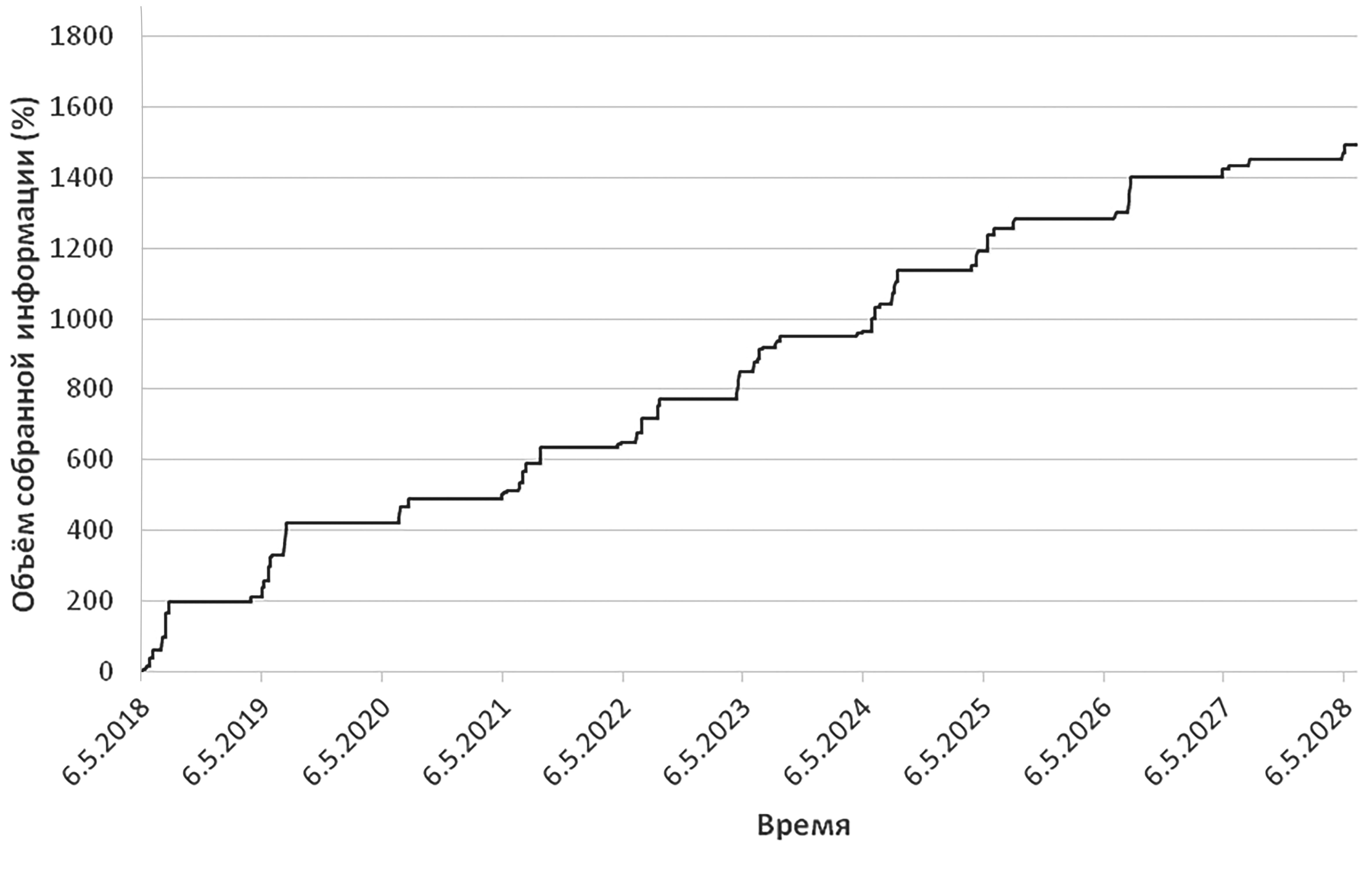 При принятии решений о целесообразности включения тематической задачи в космическую миссию также важно знать динамику сбора информации. Объем собранной информации будем измерять относительной величиной. Относительной величиной объема собранной информации будем называть отношение площади территории тестовых полигонов, покрытой ПЗ при соответствии всем внешним условиям наблюдения заданным, к полной площади всей территории тестовых полигонов. Для оценки динамики сбора информации будем записывать каждый момент времени, при котором территория любого тестового полигона попадает в ПЗ ГСК при допустимых условиях наблюдения, и величину объема, собранную за текущий шаг изменения модельного времени. По полученному списку можно построить график зависимости объема собранной информации от времени и график зависимости скорости сбора информации от времени.