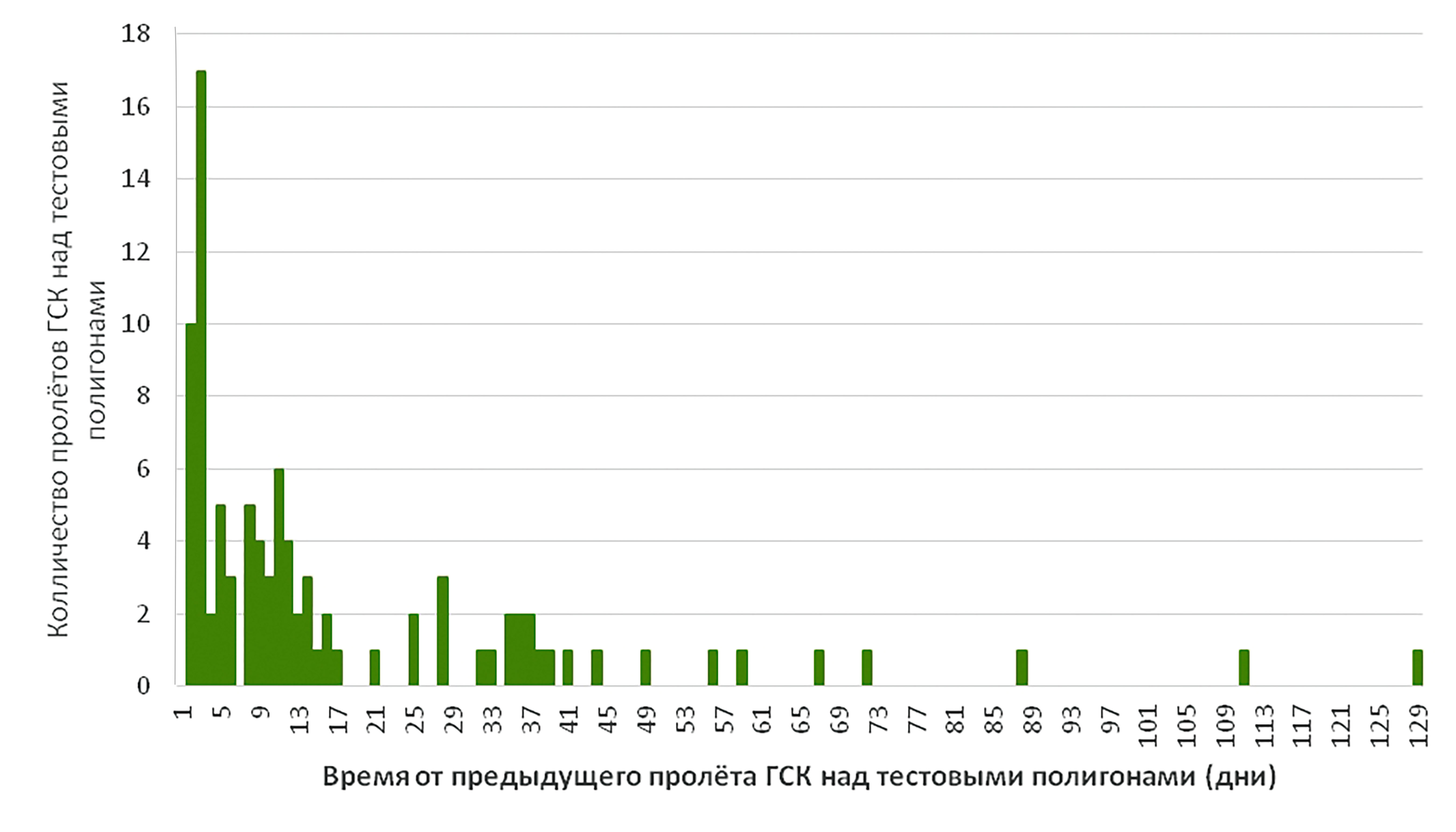 Рис. 4. Гистограмма распределения периодов между проходами ГСК тестовых полигонов с шагом разбиения в одни сутки.