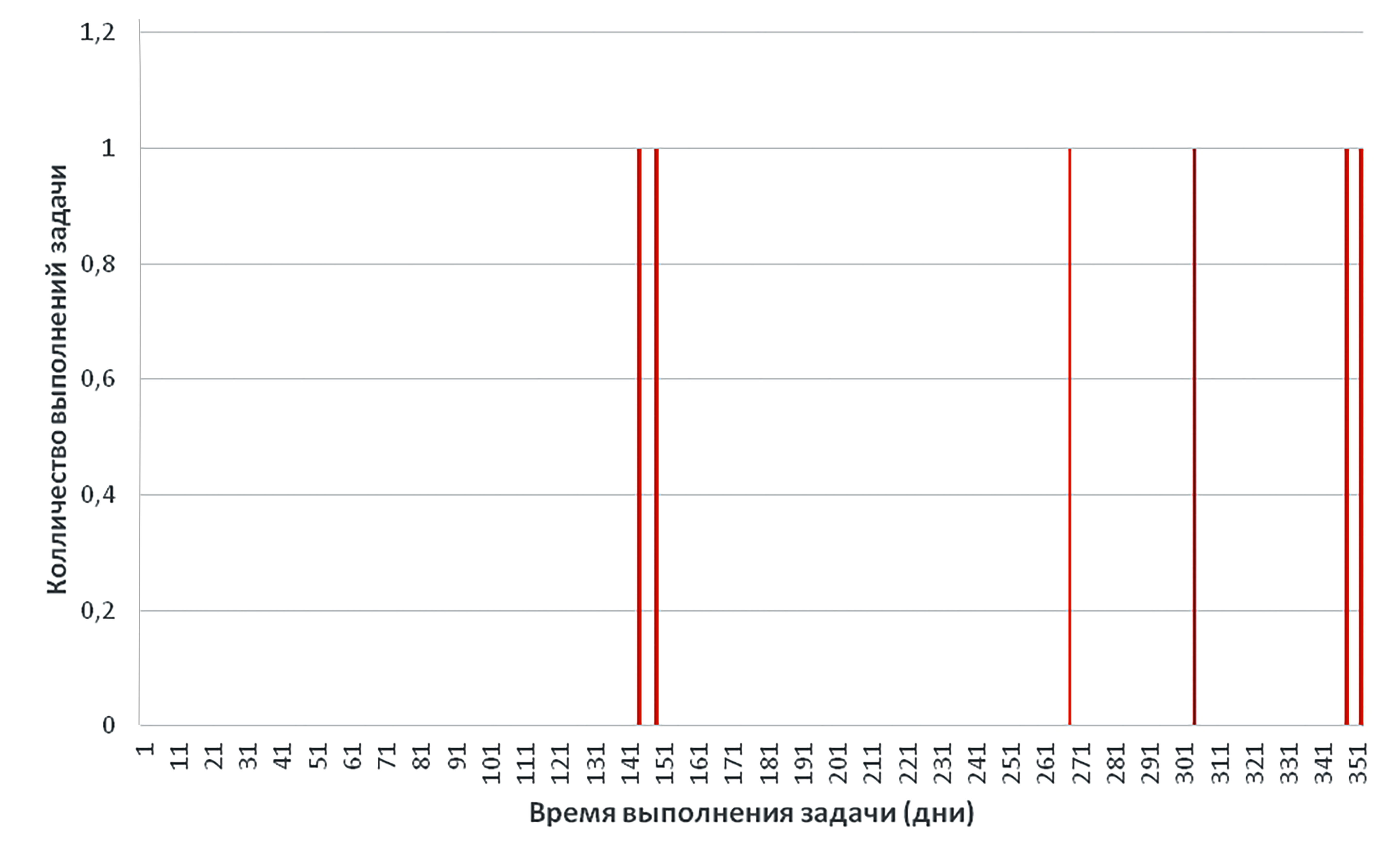 Рис. 5. Гистограмма распределения времени выполнения задачи шагом разбиения в одни сутки.