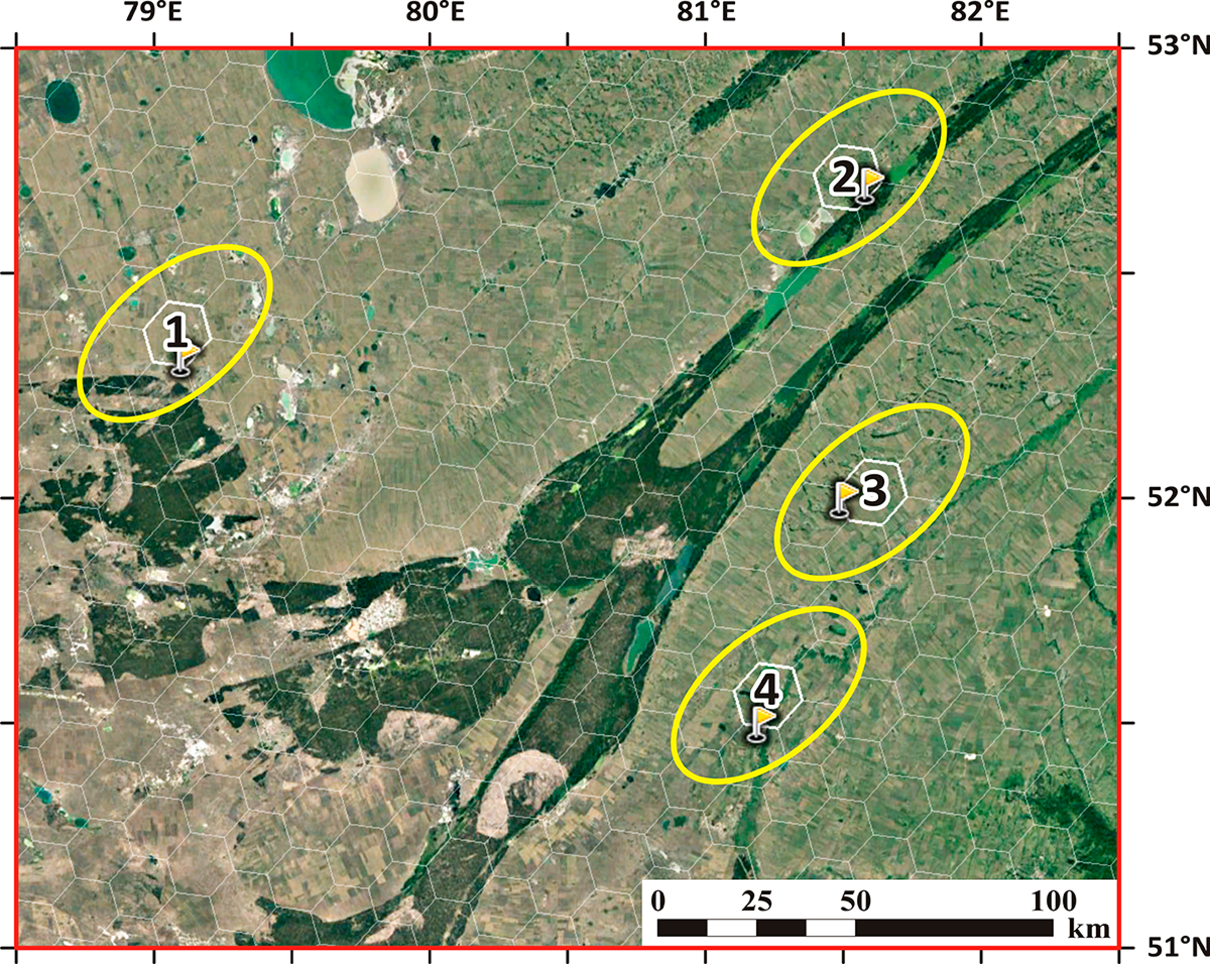 Исследования проводились на территории Алтайского края. Для оценки пространственного распределения яркостных температур ТBr подстилающей поверхности использовались данные спутника SMOS (продукт L1С) (Gutierrez, Castro, 2010). Погрешность определения ТBr изменялась от ±3 К в центре до ±6 K на краях полосы захвата шириной ~ 890 км. Спутниковая съемка исследуемой территории производилась около 7 и 21 часа местного времени на горизонтальной и вертикальной поляризации на частоте 1.41 ГГц. Разрешающая способность радиометра при зондировании под углом 42.5° составляет величину порядка 45 км. Данные L1C привязаны к дискретной геодезической сетке DGG ISEA 4H9 (Sahr et al., 2003), исследуемые ячейки которой изображены на рис. 1. Линейный размер ячейки составляет ~16 км. Такое соотношение масштаба сетки и разрешающей способности радиометра обеспечивает корректное, с точки зрения критерия Найквиста, представление результатов измерений (Pinori et al., 2008). При этом значение ТBr каждой ячейки площадью ~195 км2 характеризует излучательную способность значительно большего участка (пикселя) подстилающей поверхности (площадью от 700 до 2 000 км2, в зависимости от угла зондирования), содержащего эту ячейку.