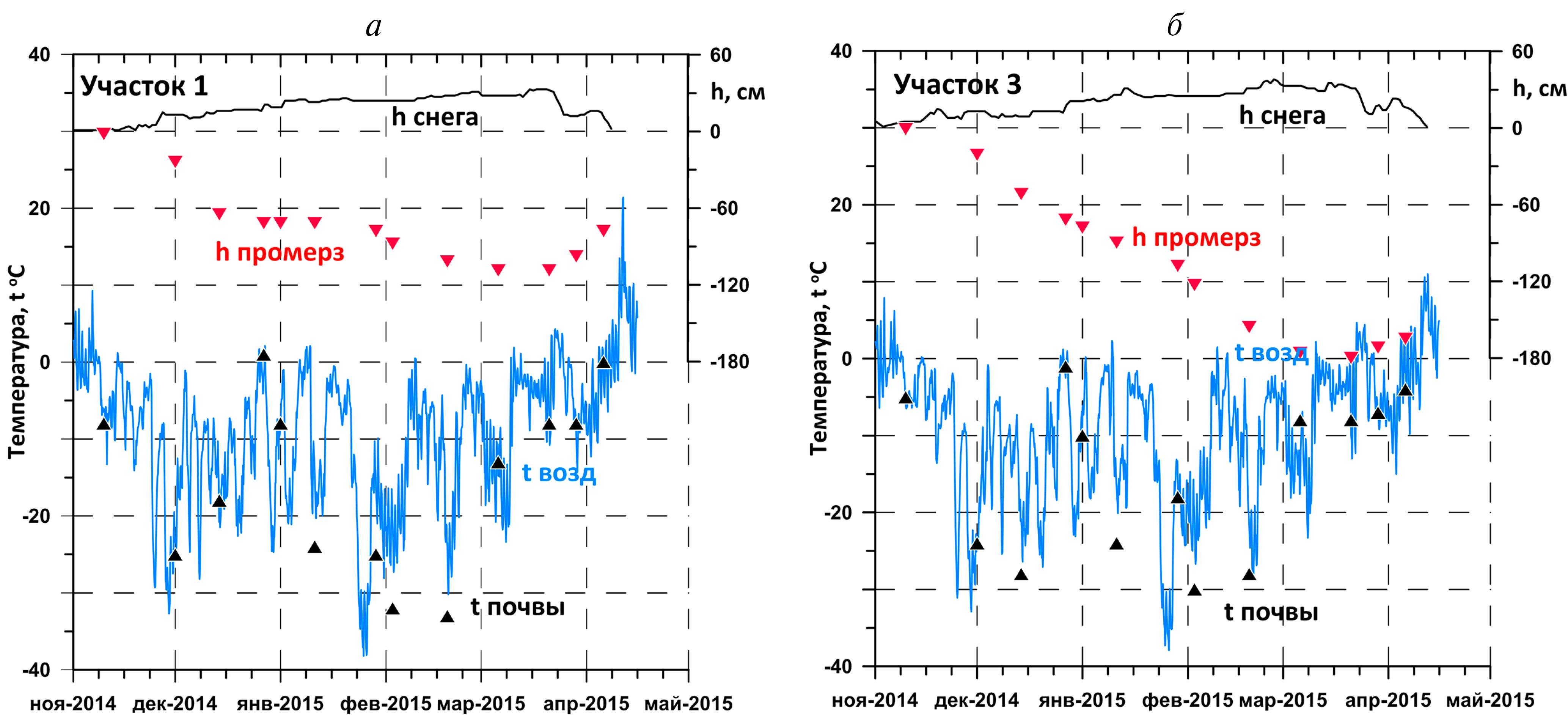 Данные метеонаблюдений: температуры воздуха и поверхности почвы, высоты снежного покрова и глубины промерзания почвы для двух исследуемых участков приведены на рис. 2.