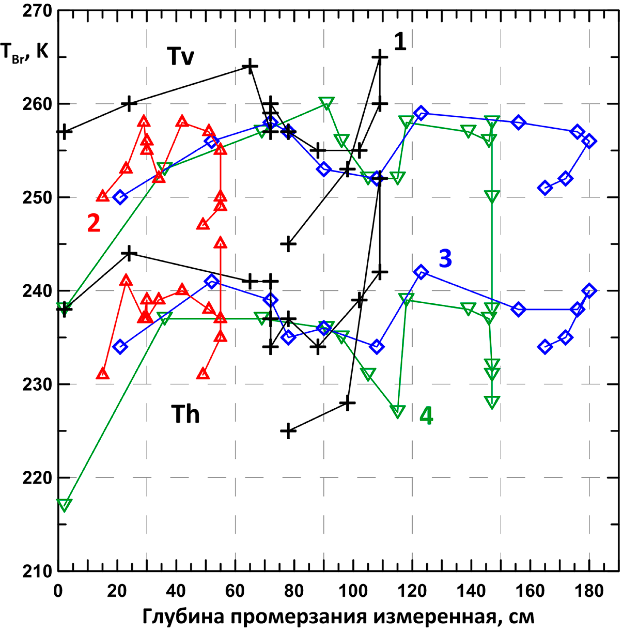 Рис. 3. Зависимости яркостной температуры (данные SMOS) от глубины промерзания почвы на тестовых участках (см. табл. 1): 1 — крест, 2 — треугольник вверх, 3 — ромб, 4 — треугольник вниз. Верхние кривые относятся к верти-кальной поляризации, нижние – к горизонтальной.