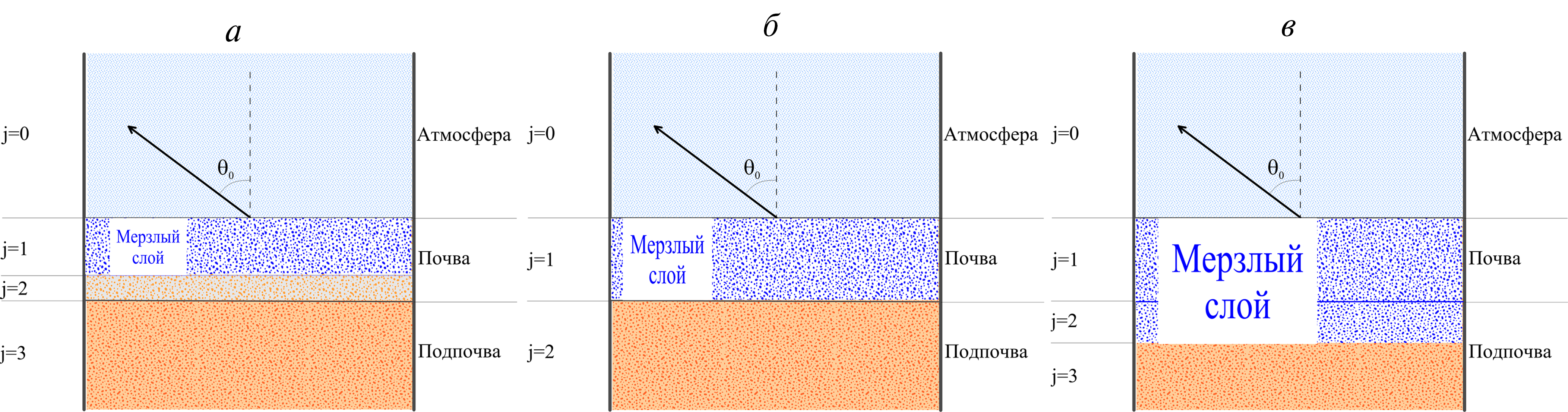 Для схемы на рис. 4в, индекс j обозначает: 0 — свободное пространство (атмосферу); 1 – мерзлую почву; 2 — мерзлую подпочву; 3 — теплую подпочву.