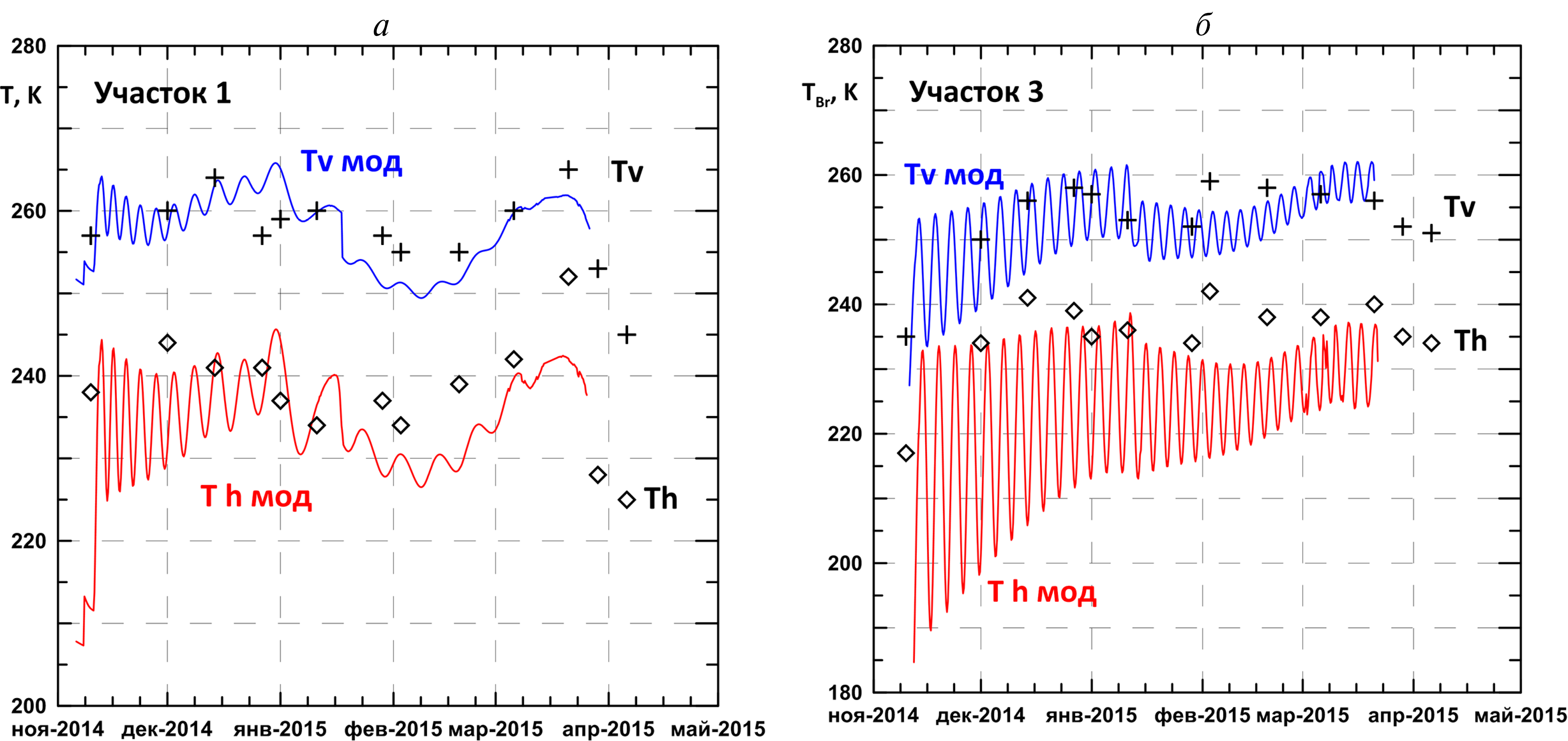 Рис. 5. Сезонные зависимости яркостной температуры на тестовых участках 1 — а и 3 — б, данные SMOS (значки) и модельный расчет (сплошные линии). Верхние кривые относятся к вертикальной поляризации, нижние — к горизонтальной.