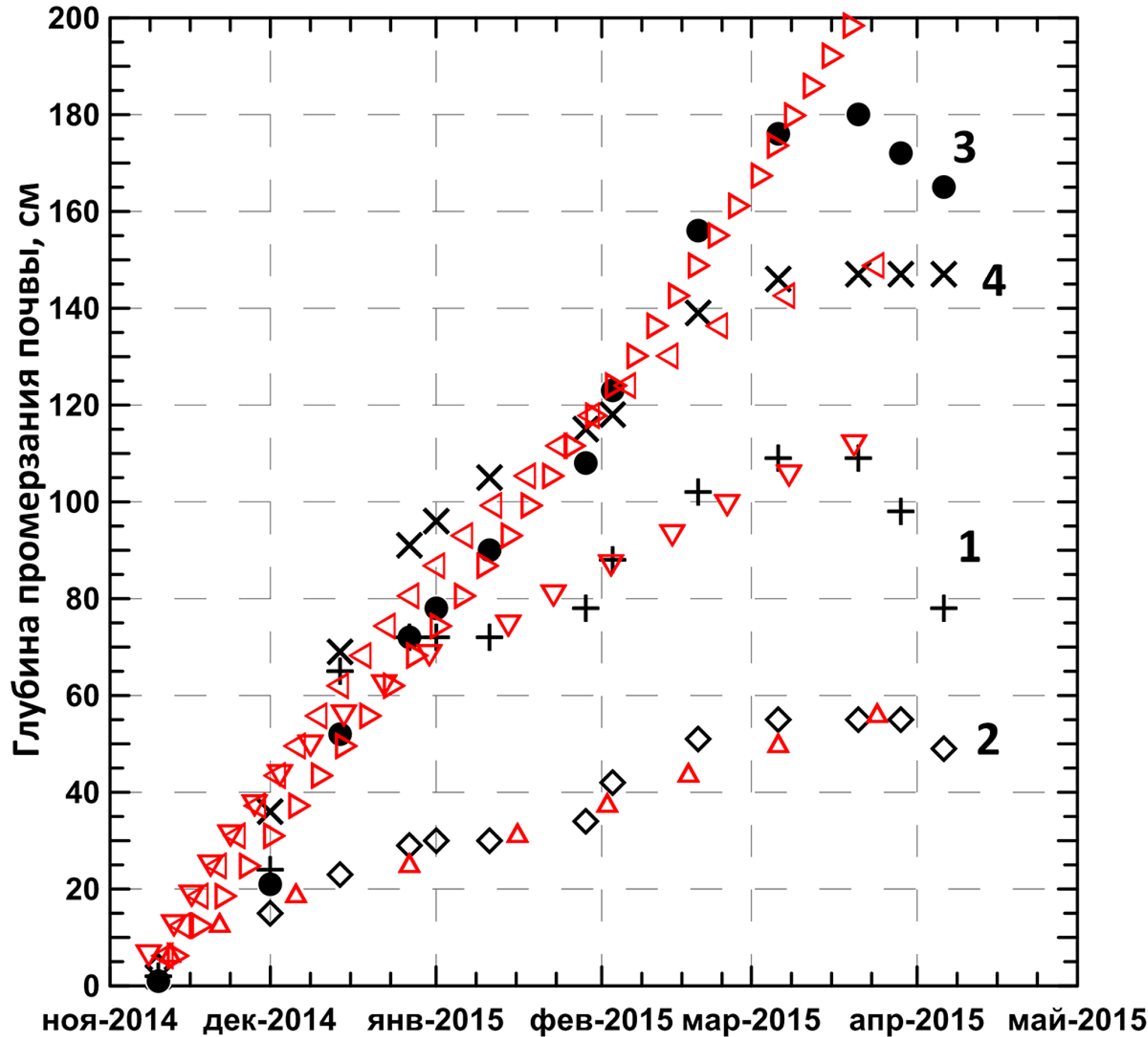 Рис. 6. Значения толщин мерзлого слоя почвы, измеренные и рассчитанные по формуле (4) для четырех исследуемых участков. Номер участка указан рядом с зависимостью, черные значки соответствуют измеренным значениям, красные треугольники — рассчитанным.
