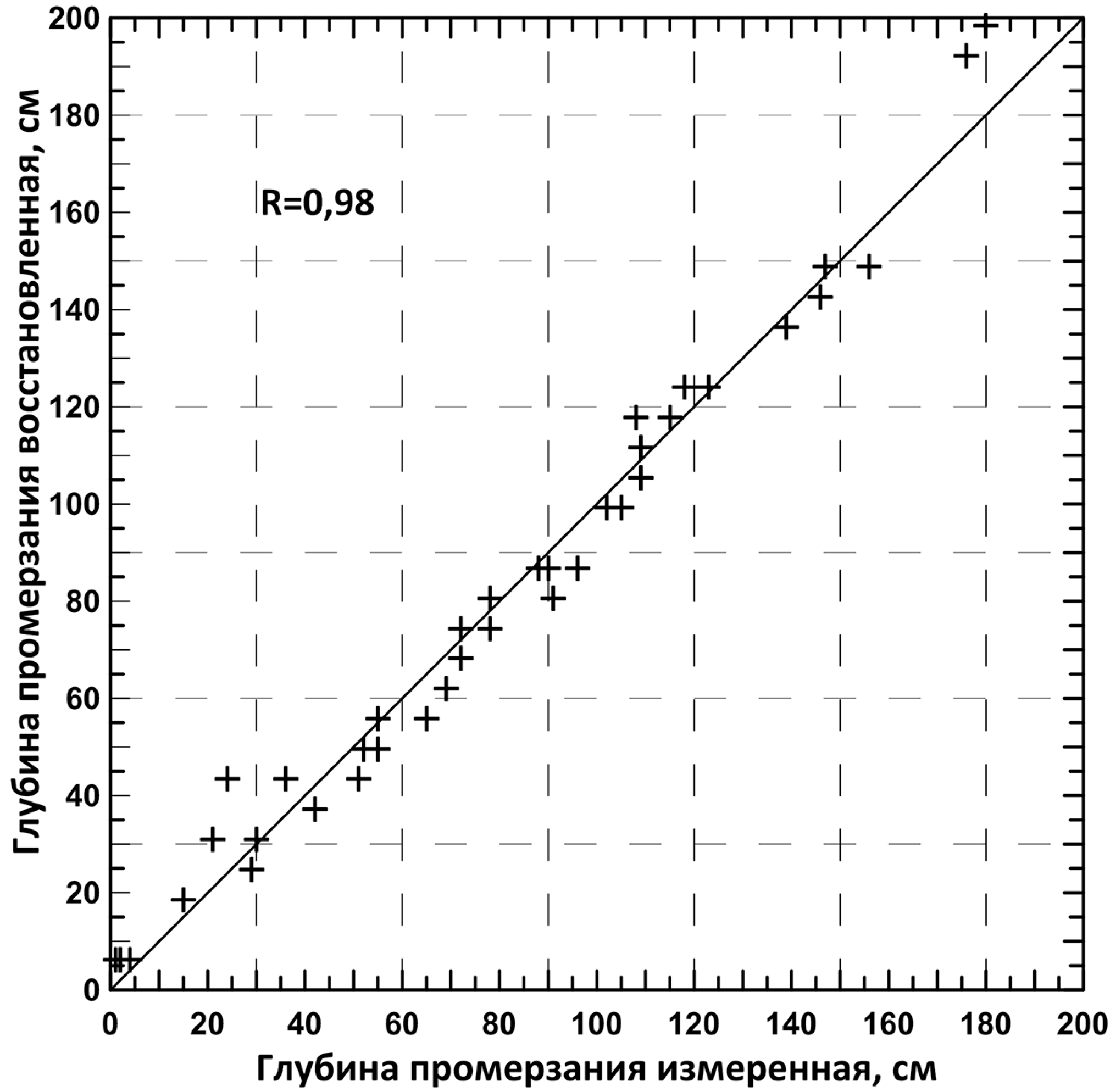 Рис. 7. Диаграмма рассеяния глубины промерзания почвы измеренной и восстановленной по интерференционной модельной зависимости.