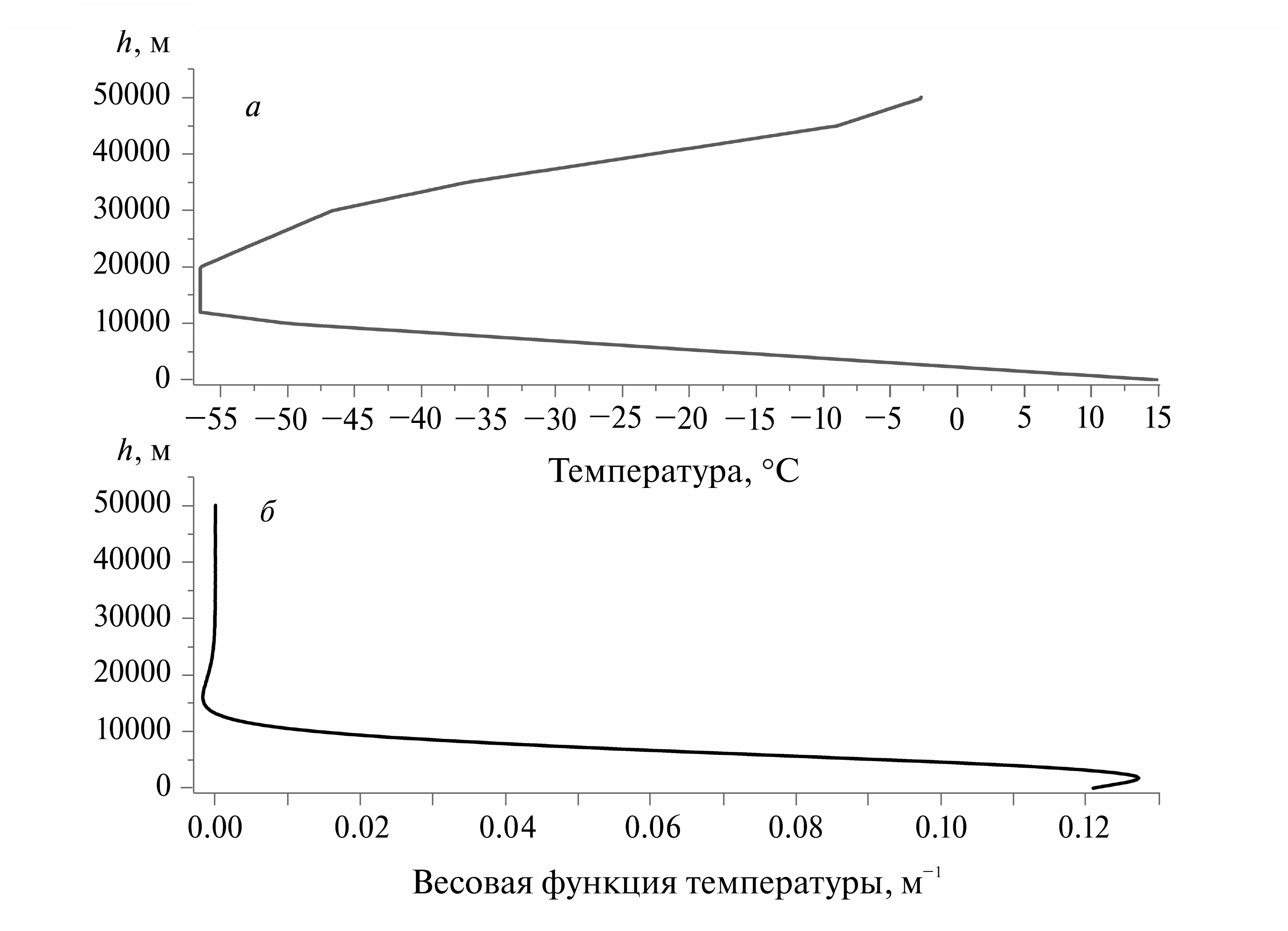 Базой для анализа послужили среднемесячные температурные ряды спутникового зондирования на основе семейства многоканальных микроволновых радиометров MSU/СВЧЗ (Microwave Sounding Unit/Сверхвысокочастотное зондирование) и AMSU/РСВЧЗ (Advanced Microwave Sounding Unit/Расширенное сверхвысокочастотное зондирование), первый из которых однополосный приемник, настроенный на 53.74 ГГц с полосой пропускания 0.20 ГГц, второй двухполосный на частотах 53.71 и 53.48 ГГц, с полосой пропускания 0.17 ГГц. Для решения поставленной задачи из огромного массива данных были отобраны инструментальные спутниковые наблюдения за яркостной температурой в нижнем слое атмосферы TLT/ТНТ (Temperature Lower Troposphere/Температура Нижней Тропосферы). Вертикальный профиль нижних слоев атмосферы и высотный диапазон зондирования показаны на рис. 1а, б. Массив данных ТНТ находится в свободном доступе на сайте https://www.remss.com, в двух вариантах: графическом и netCDF форматах, — первый удобен для обработки в программе ArcGis (https://www.arcgis.com), второй в MatLab (https://www.mathworks.com). Среднемесячные данные ТНТ представлены на регулярной сетке с разрешением 2.5° × 2.5° для всего земного шара за период с 1979 по 2017 гг. Детальное описание методов измерений и методики обработки используемых данных дистанционного зондирования представлено в работах (Mears, Wentz, 2009, 2017). По интересующей территории отбирались температурные данные, в результате по искомой площади были сформированы 12 полигонов (эквивалентный одному пикселу каждый), соответствующих территории Южного Урала.