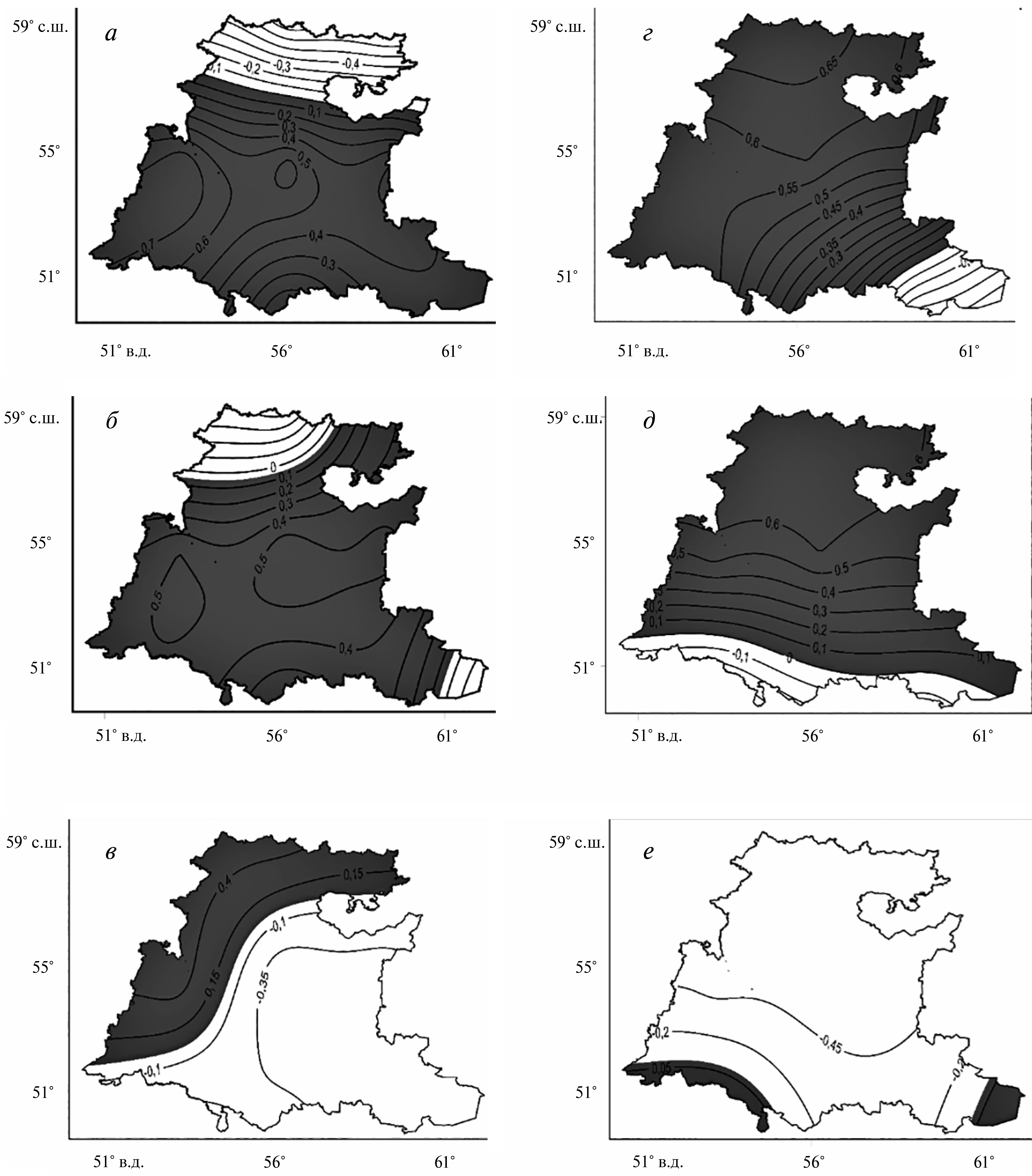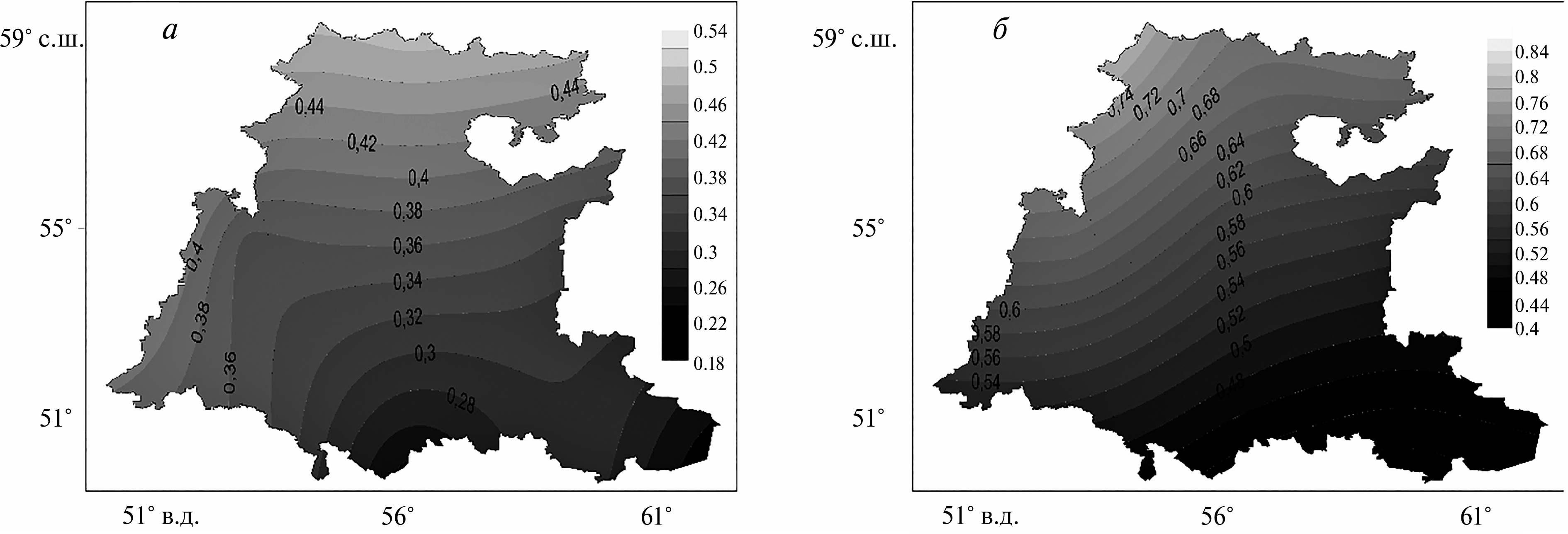 Рис. 5. Пространственное распределение значений коэффициента линейной корреляции r между временными рядами среднесезонной яркостной температуры, осредненной по территории Южного Урала, и временных рядов ЕОС1 для зимы а и лета б.