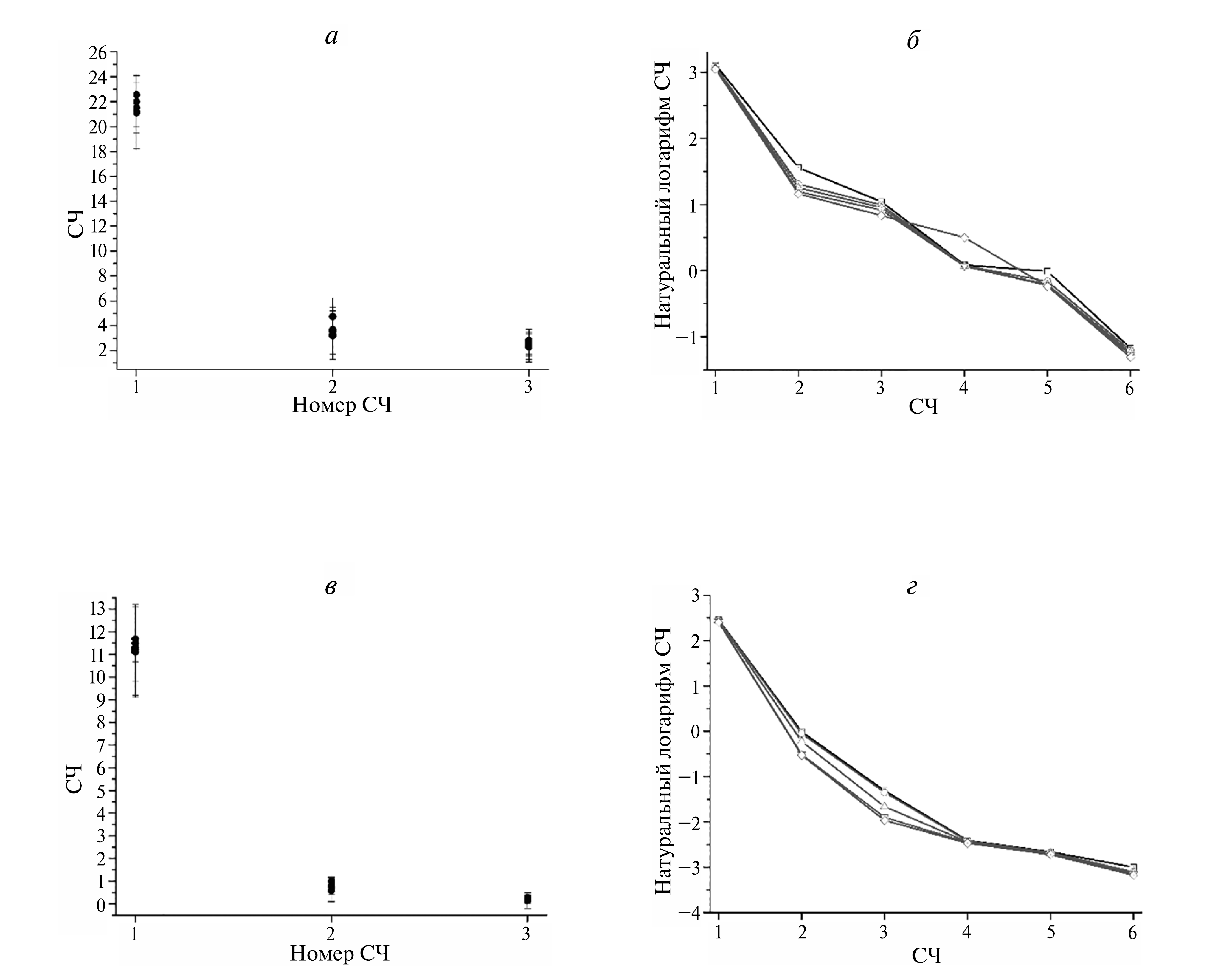 Рис. 3. Диаграмма первых трех собственных чисел ковариационных матриц: а – зимний сезон, в – летний сезон; спектры шести собственных чисел ковариационных матриц: б – зима, г – лето.
