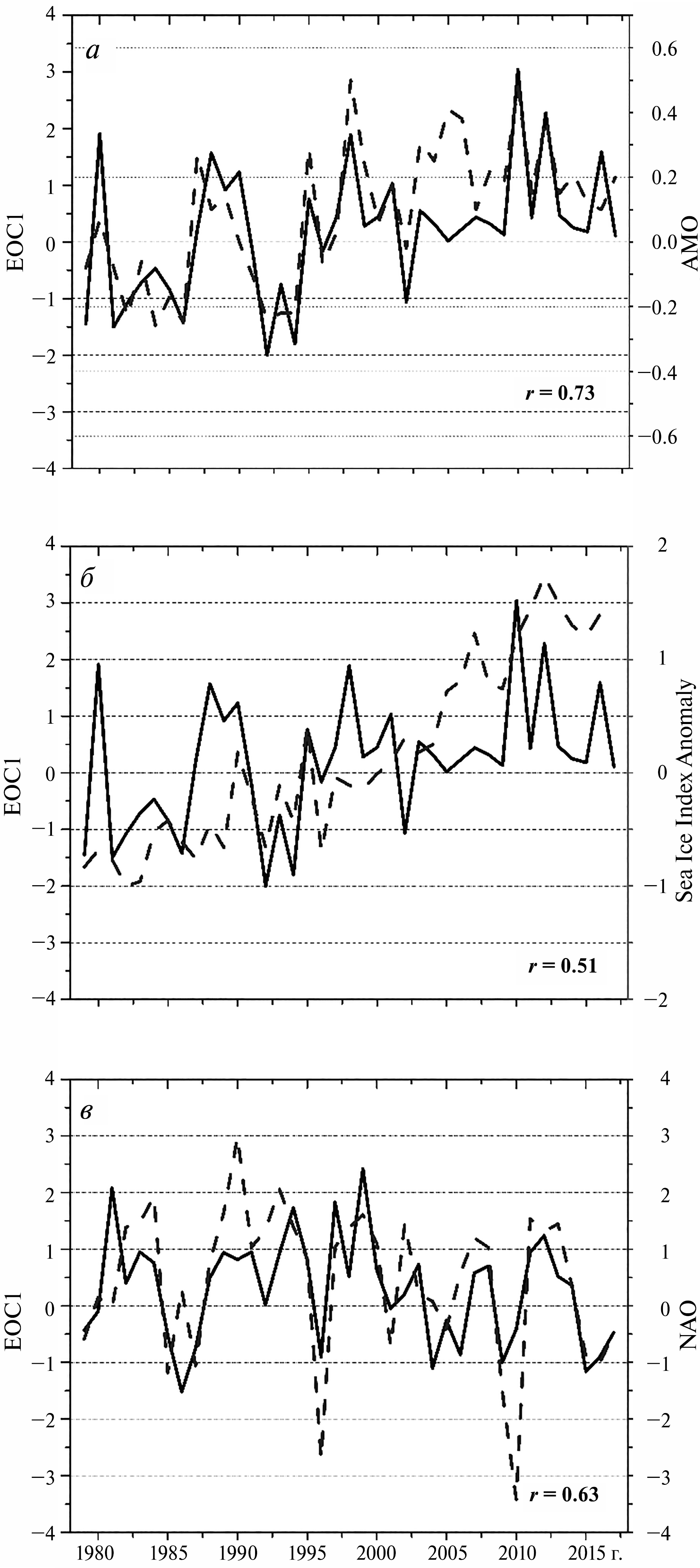 Рис. 4. Динамика климатических индексов AMO, Sea Ice Anomaly и NAO (шкала справа, пунктирная серая линия) и отдельных ЕОС1: а, б – летние месяцы, в – зимние (шкала слева, сплошная черная линия); r – значение линейного коэффициента корреляции Пирсона.