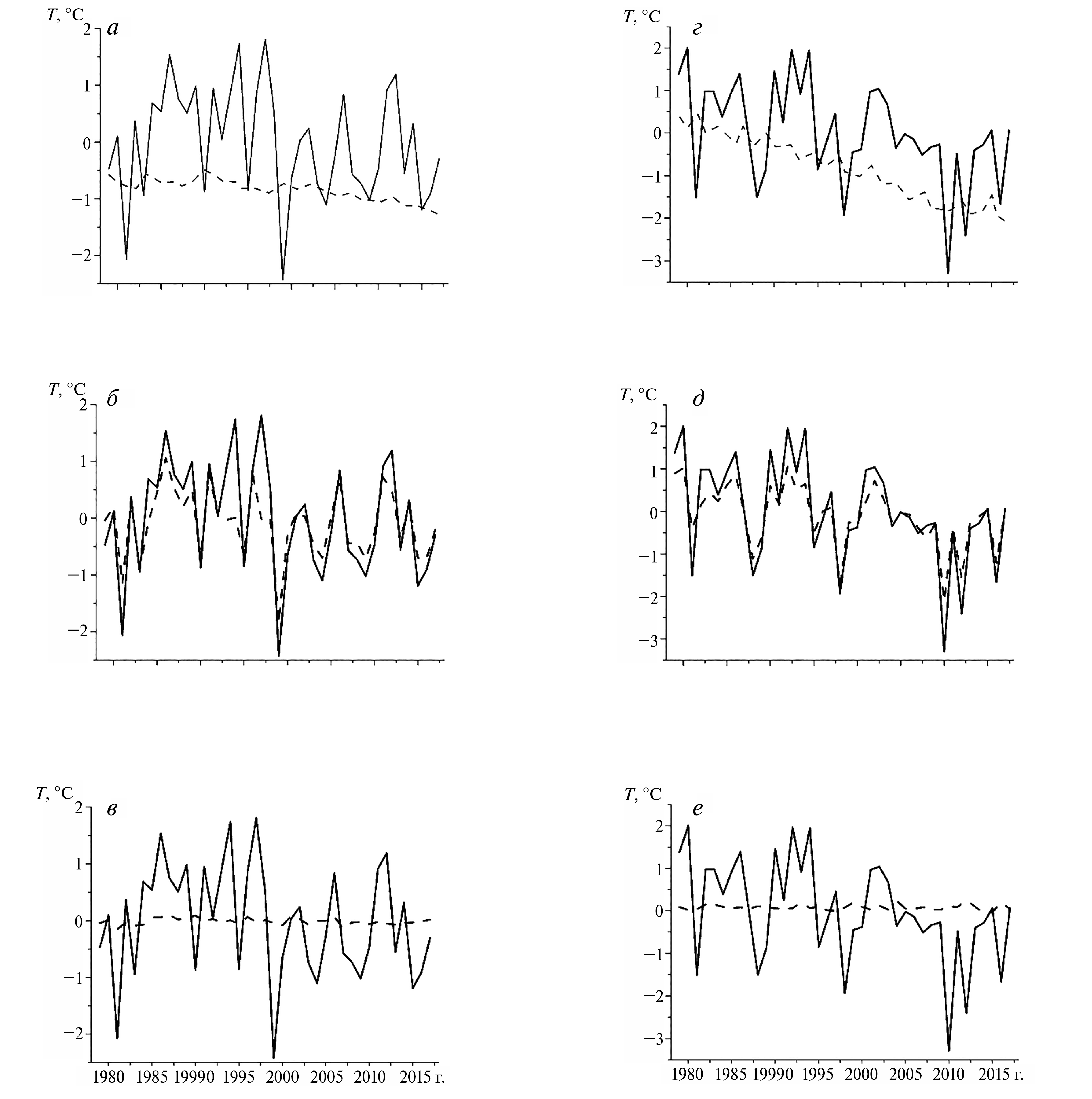 Для того чтобы оценить вклад изменчивости, связанный с выявленными аномалиями ЕОС, из осредненных по исследуемому региону температурных вариаций были вычтены аномалии температуры, как связанные с ЕОС1‒3 по отдельности, так и с суммой отдельных ЕОС1, 2, 3. Остаточные аномалии в сравнении с исходными данными представлены на рис. 6а–в для зимнего и рис. 6г–е для летнего периодов. В зимний период на долю ЕОС1 и ЕОС3 приходится 84% общей температурной изменчивости, ЕОС2 не вносит существенного вклада, что наглядно продемонстрировано на рис. 6б. Из рис. 6а видно, вклад ЕОС1 является доминирующим на всем интервале наблюдений и показывает отрицательный тренд.