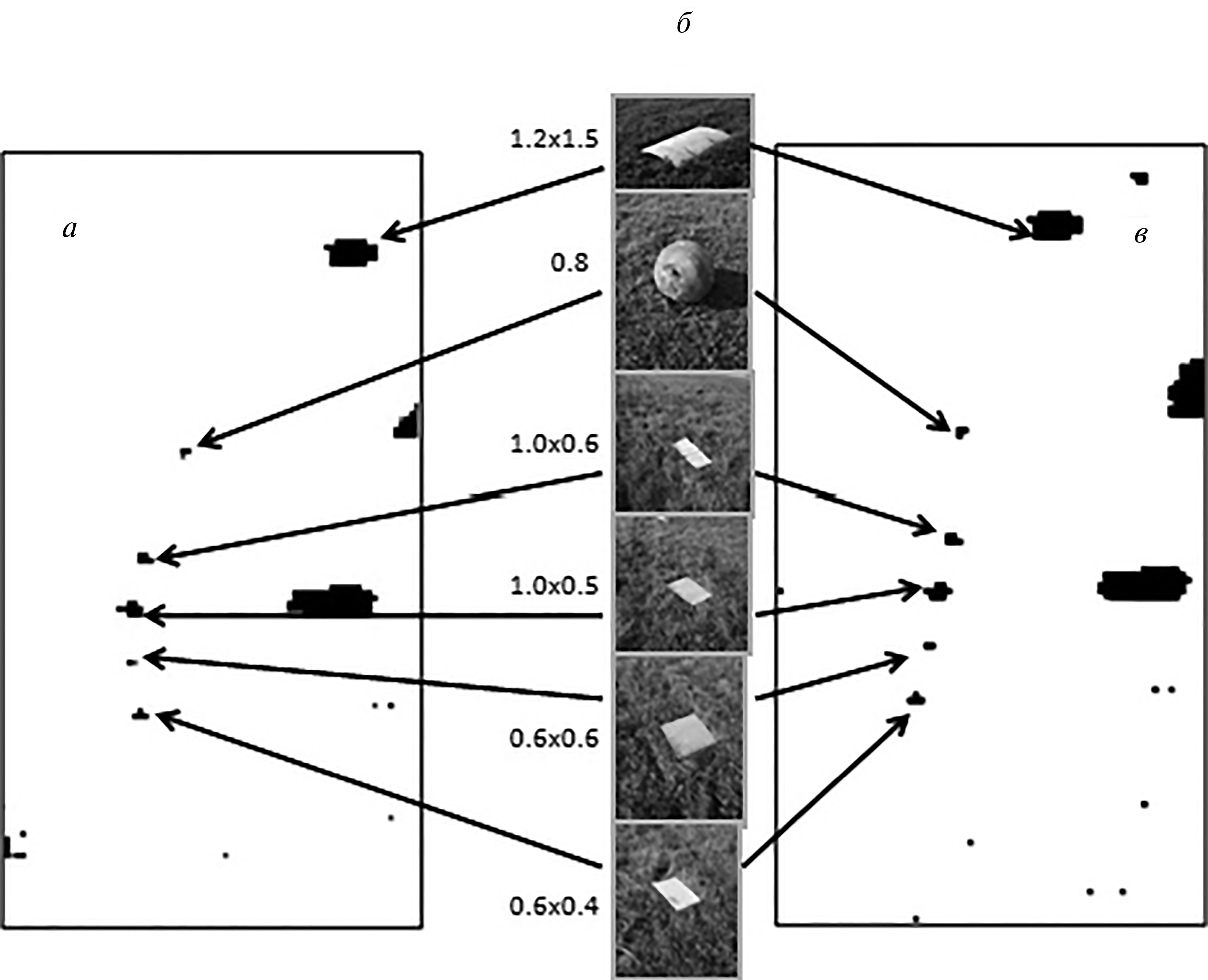 Означенные вырезы были сегментированы с применением эквализации (гистограммного преобразования) визуальным подбором порогов (Смирнов и др., 2016б). Из полученных образов, для последующего анализа, выделены собственно объекты поиска. Их совместное представление, вместе с фрагментами фотоснимков искомых объектов, приведено на рис. 3, контрасты образов вырезов инвертированы для повышения качества отображения. Размеры указаны в метрах.