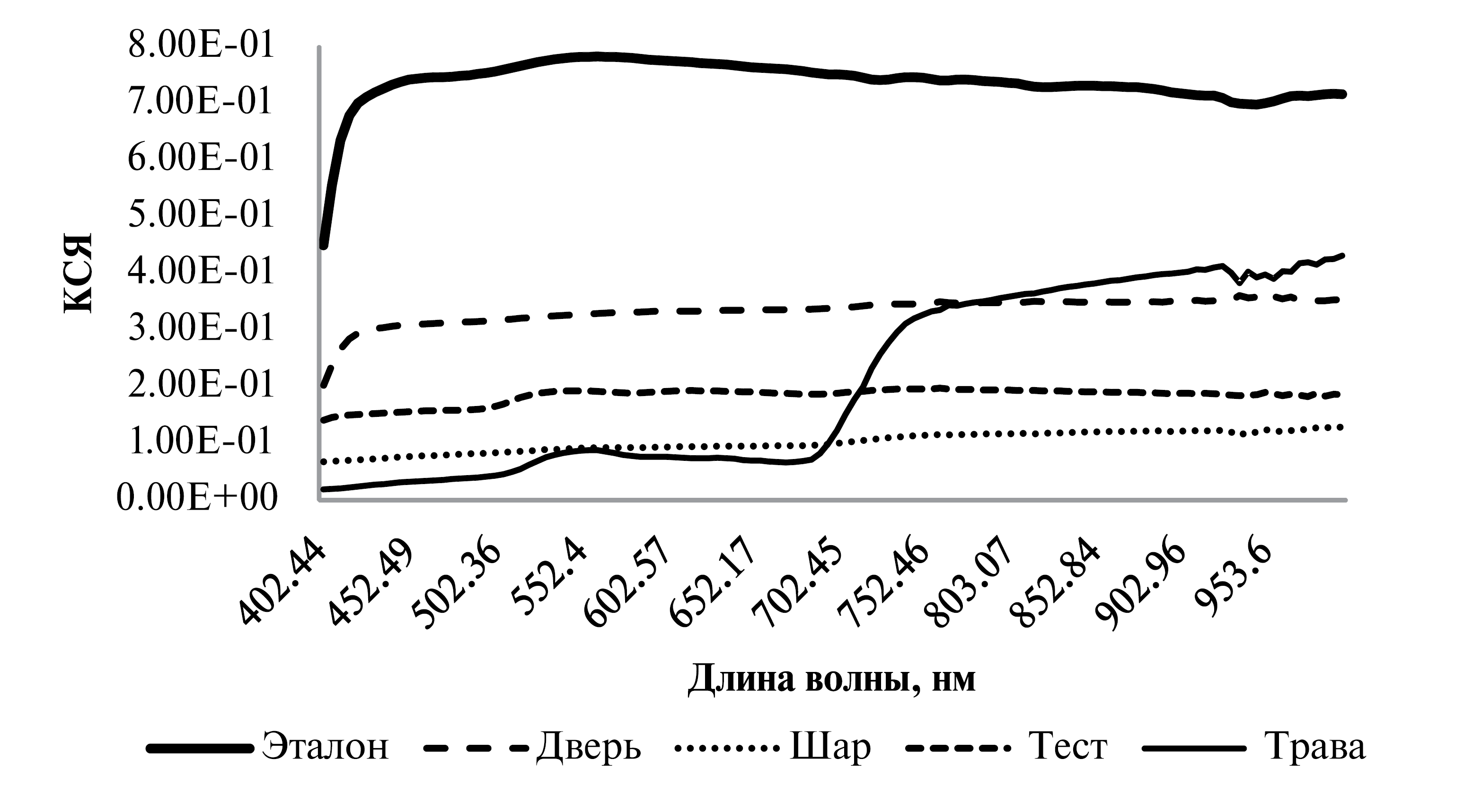 По каждому тестовому объекту наблюдения, на земле, предварительно измерялись коэффициенты спектральной яркости (КСЯ) с помощью полевого спекторадиометра (SR‑3500, 2013) со спектральным разрешением около 3.5 нм в диапазоне от 350 до 1000 нм. Измерения проводились таким образом, чтобы «пятно» наблюдения максимально охватывало каждый объект в пределах его размера. По фрагментам «дверь» и «шар», в силу их некоторого отличия, брались результаты, каждый из которых усреднялся по совокупности 5-ти реализаций. По остальным фрагментам усреднялись все измеренные данные. Полученные спектры помещались в базу опорных сигнатур в виде трех оригинальных образов под названиями «дверь», «шар» и «тест». Все кривые были приведены к биннингованному спектру авиационного прибора путем линейной интерполяции — рис. 4. Здесь же представлен спектр измеренного спектрорадиометром калибрующего «эталона». Кроме того, сюда добавлена спектральная сигнатура травы как основного окружающего объекты фона на рассматриваемой сцене.