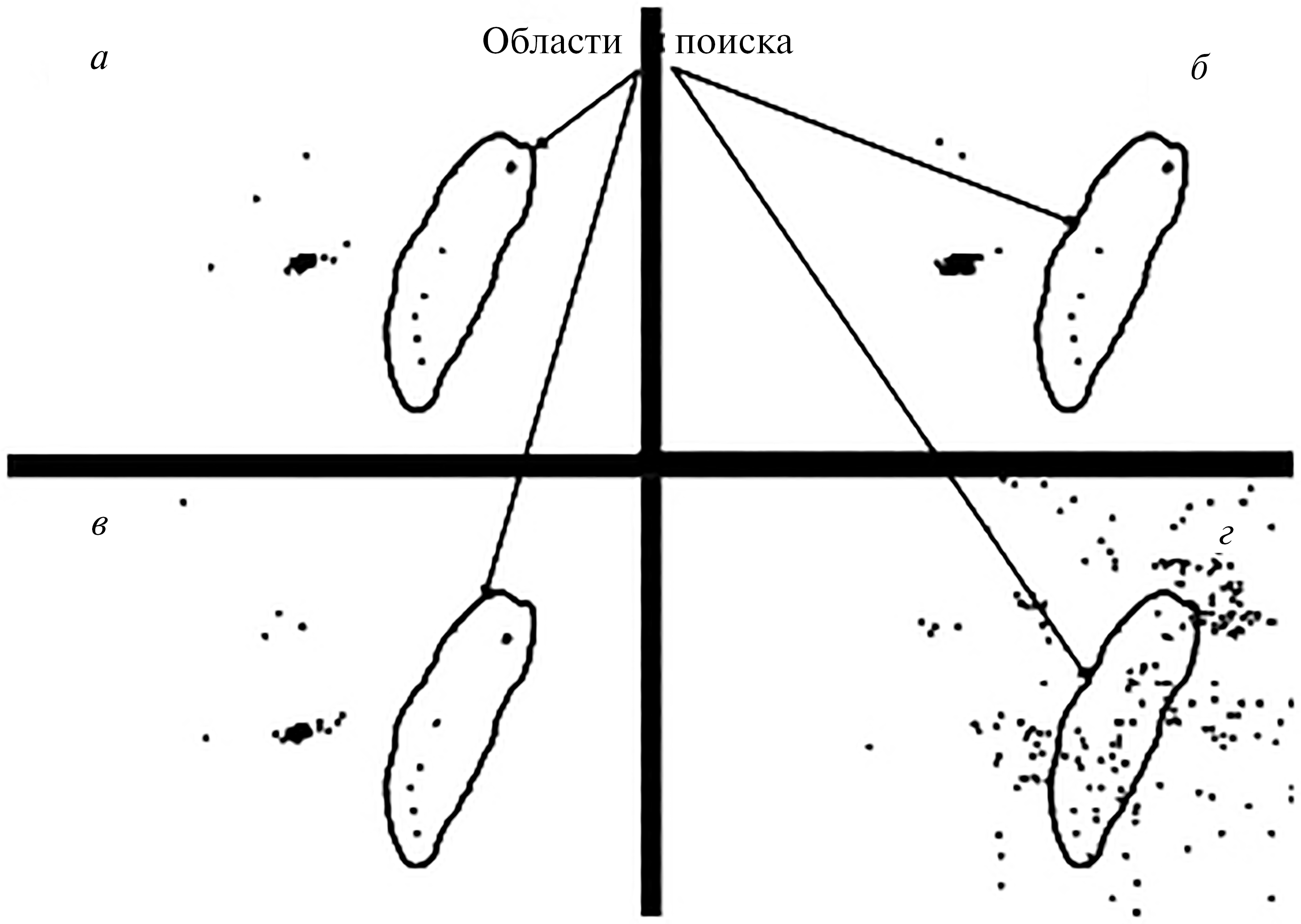Аналогичные расчеты спектральной идентификации снимков были проведены по данным, подвергнутым описанной выше предварительной обработке. Истинное положение элементов поиска в этом случае определялось приведенным выше на рис. 3в.