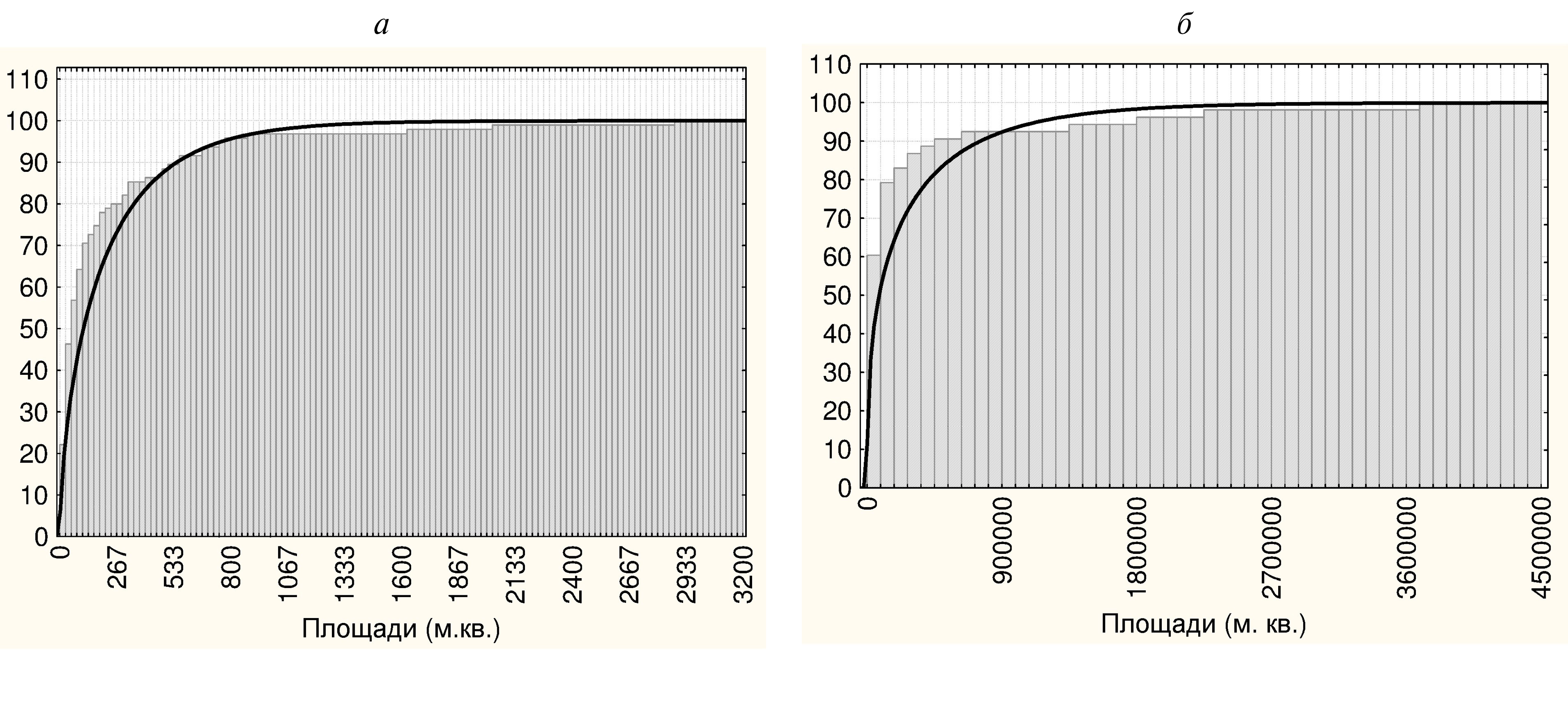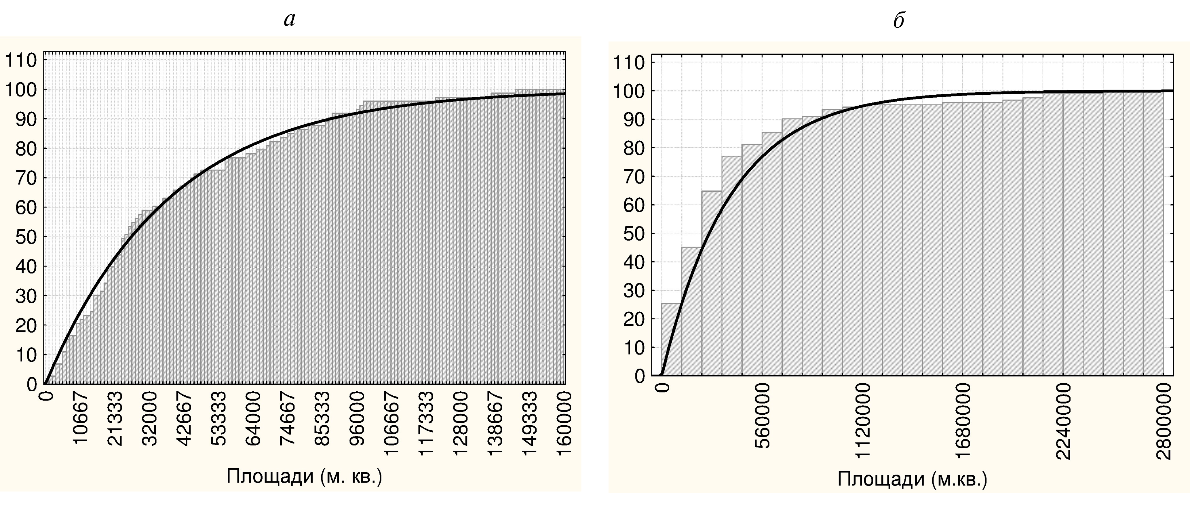 На всех участках была выполнена проверка соответствия распределения площади хасыреев теоретическому экспоненциальному распределению (рис. 3) при объемах выборок 73–122. Анализ показывает соответствие эмпирических данных полученным результатам на уровне значимости 0.95 (табл. 1).