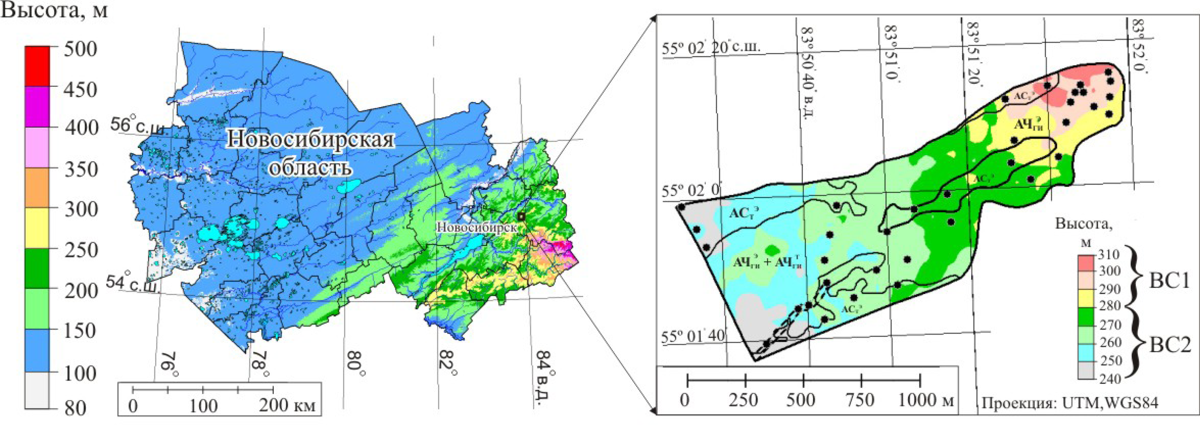 Рис. 1. Карта территории исследования и схема отбора почвенных проб. Условные обозначения: сплошной линией показаны ареалы почв, точками — схема отбора почвенных проб. Склоновые позиции: первая (ВС1) и вторая (ВС2) высотные ступени, ложбина стока выделена пунктирной линией. Почвы: АЧГИЭ — агрочернозем глинисто-иллювиальный элювиированный; АЧГИТ — агрочернозем глинисто-иллювиальный тeмноязыковатый; АСТ — агротемно-серая.