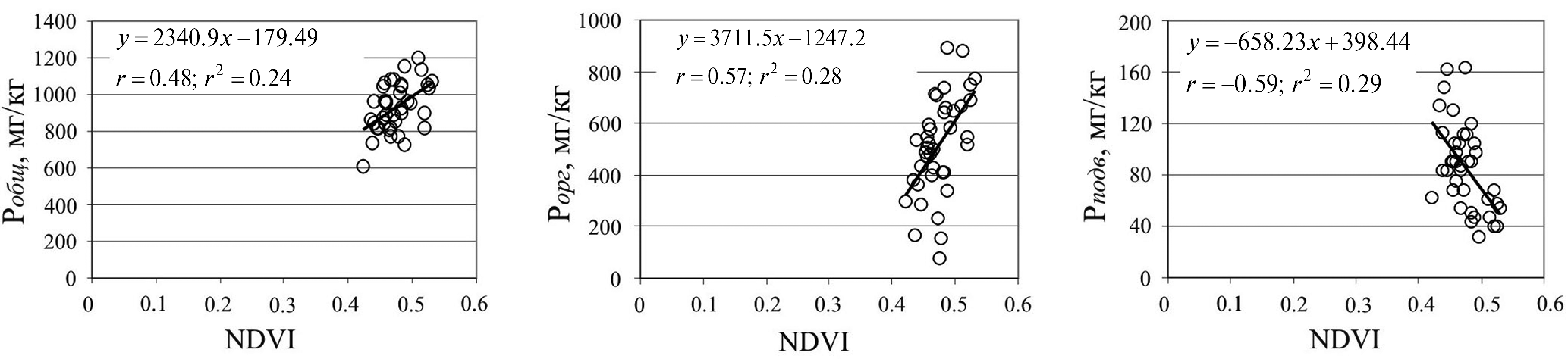 Рис. 2. Регрессионные модели зависимости между содержанием фосфора (общего, органического, подвижного) в почвах и значениями NDVI.