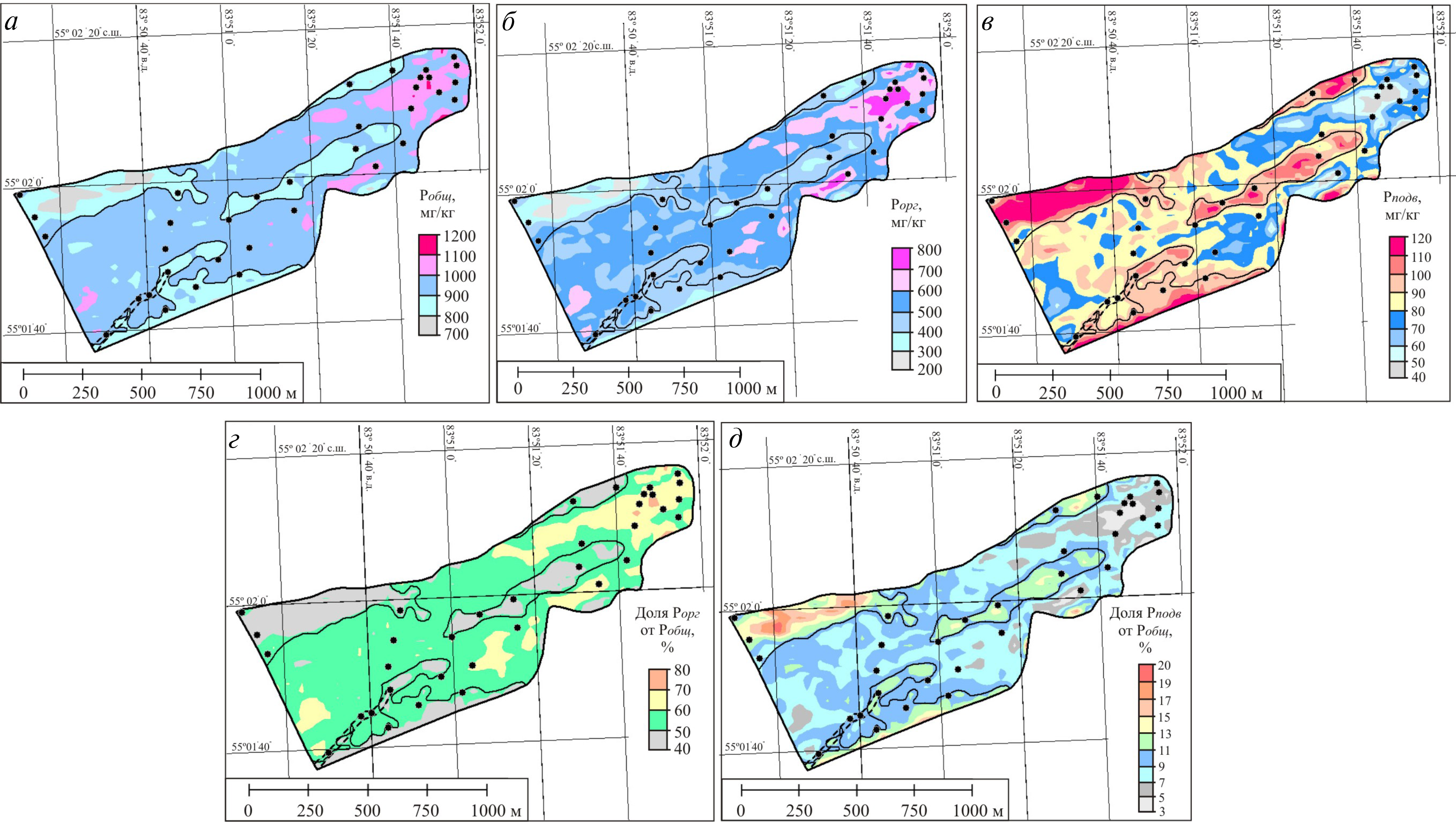 Рис. 3. Прогнозные карты содержания фосфора: а — общего; б — органического; в — подвижного; г — доля органического фосфора от общего; д — доля подвижного фосфора от общего.