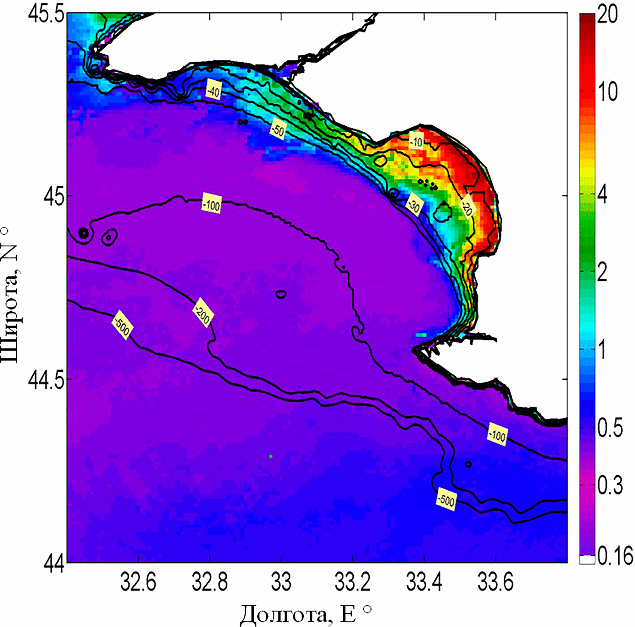 Рис. 1. Средняя концентрация ВВ у побережья Западного Крыма (2003 – 2015 гг.) по данным MODIS/Aqua.